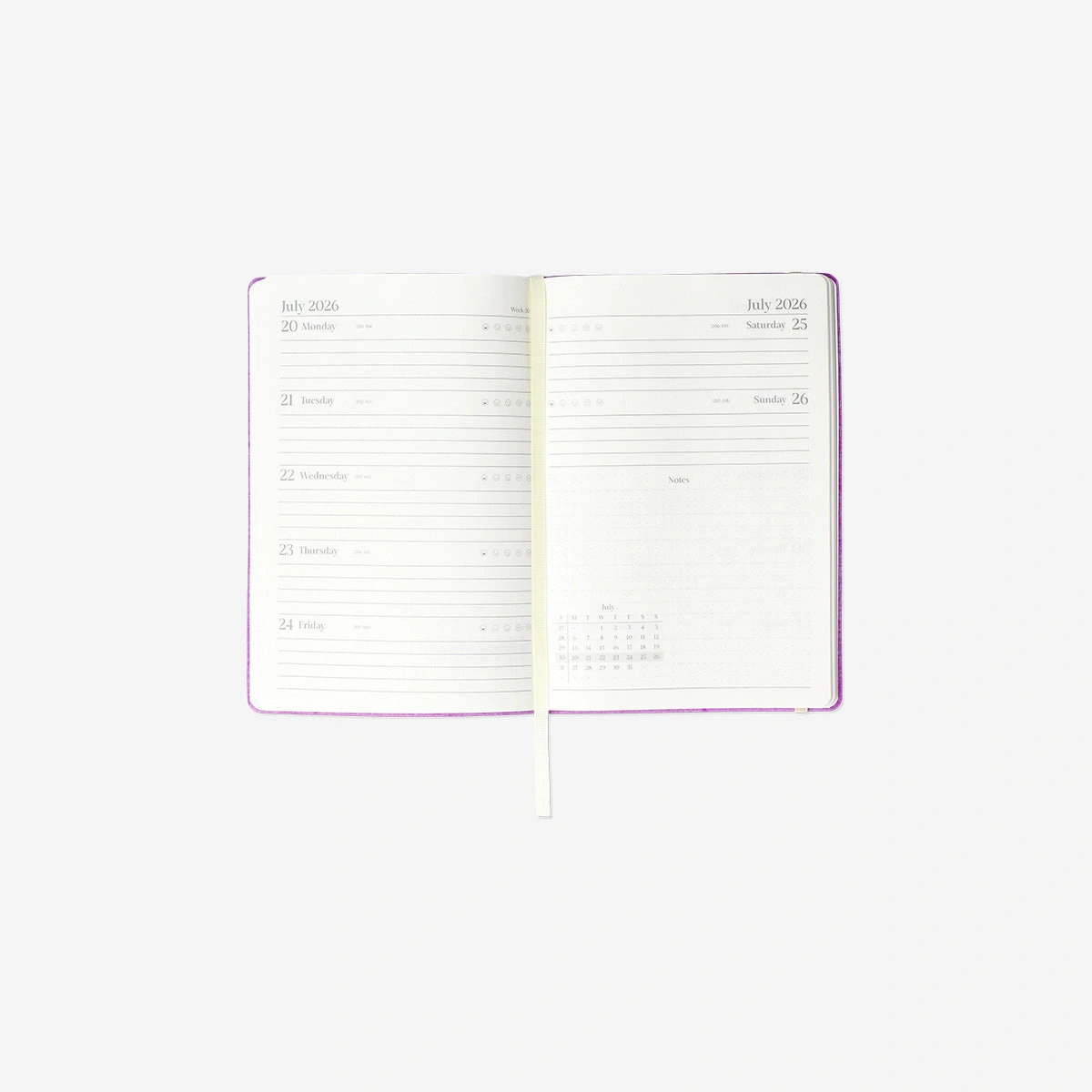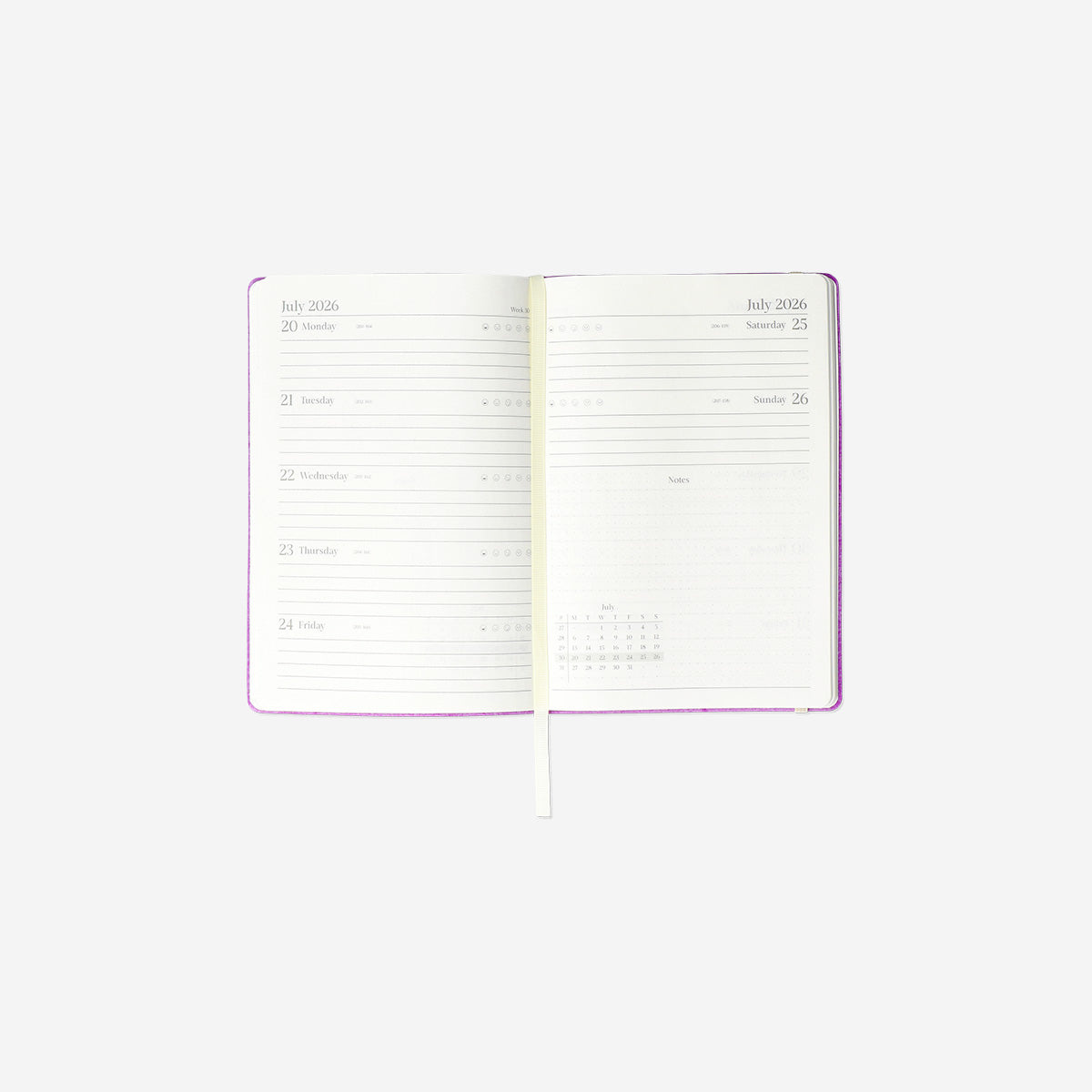 Mor A5 Haftalık 2026 Planlayıcı, kompakt boyutuyla masaüstünde veya seyahat sırasında rahatlıkla kullanılabilir. Temiz çizgilere sahip düzenli tasarımı, profesyonel ve kişisel planlamalarınızı verimli bir şekilde yönetmenizi kolaylaştırır. 2026 yılı boyunca haftalık programınızı düzenli tutarak motivasyonunuzu artırır ve üretkenliğinizi destekler. Okul, iş veya günlük yaşam için ideal olan bu ajanda, yılınızı şık bir şekilde planlamanın en pratik yollarından biridir.