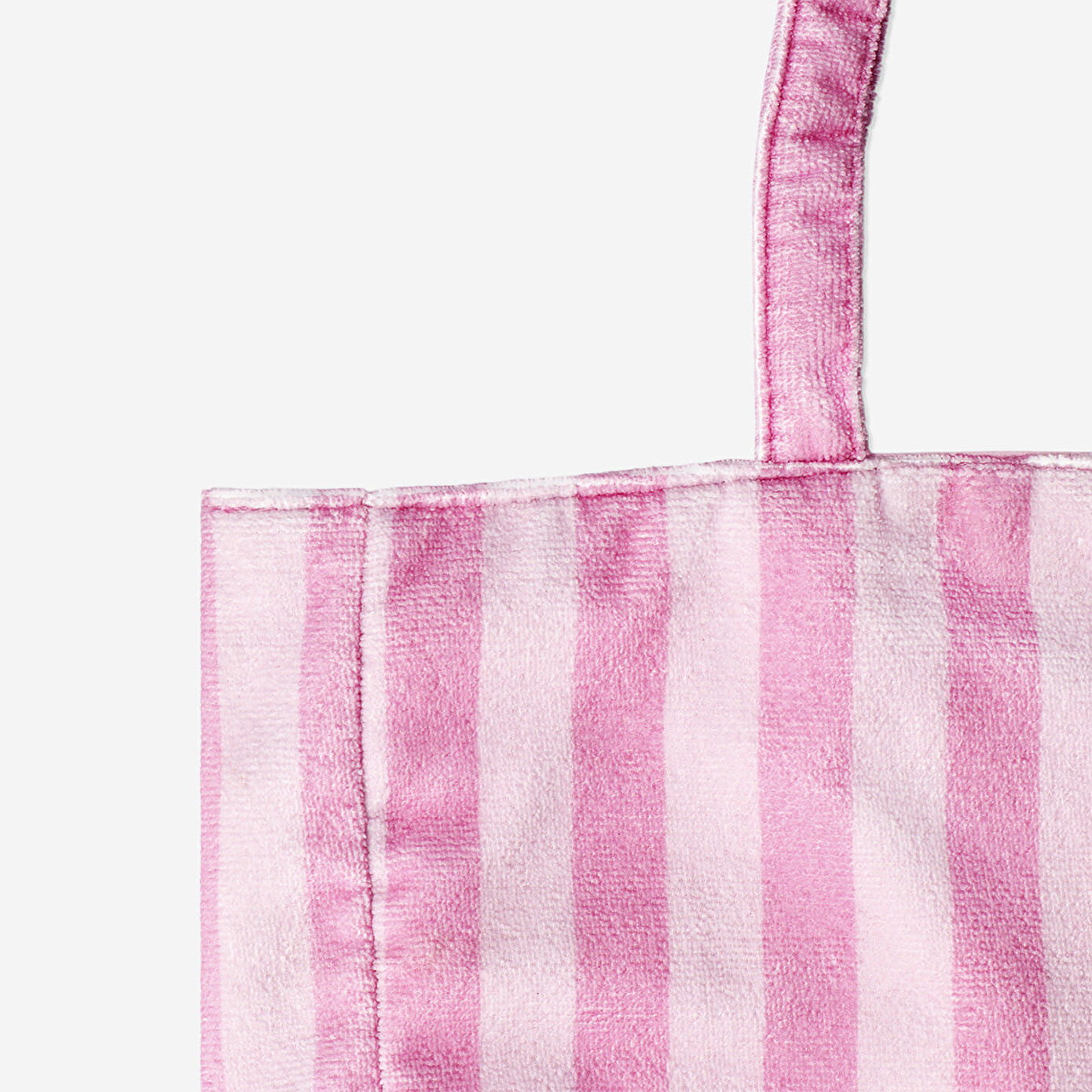 Pembe Çizgili Bez Çanta, alışveriş, plaj gezileri veya günlük kullanım için mükemmel bir tercihtir ve günlük ihtiyaçlarınıza şık bir dokunuş katmanızı sağlar. Yumuşak polyesterden üretilen bu geniş çanta, 41,5 x 31,5 x 9 cm boyutlarında olup kişisel eşyalarınızı, market alışverişlerinizi veya seyahat ihtiyaçlarınızı taşımak için geniş bir alan sunar. Frotte kumaşı çantaya benzersiz bir doku verirken, pembe çizgili tasarımı taze ve eğlenceli bir görünüm katar.