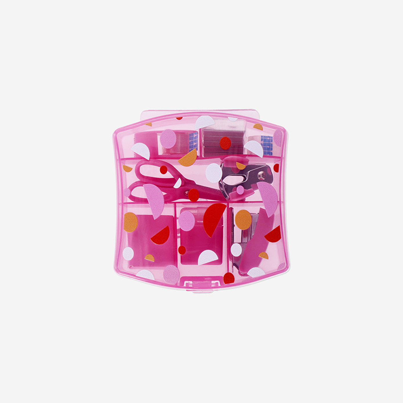 Pembe Kutulu Kırtasiye Seti, okul, ofis veya ev kullanımı için mükemmel bir düzenleyici çözüm sunar. 10,5 x 10,7 x 3 cm boyutlarındaki bu kompakt plastik set, temel ofis malzemelerini – makas, bant, zımba, yapışkan notlar ve daha fazlasını – bir arada tutarak işlerinizi kolaylaştırır. Tüm malzemeler şık ve pratik bir pembe kutuda düzenlenmiştir, böylece çalışma alanınızda veya çantanızda her zaman elinizin altında olur.