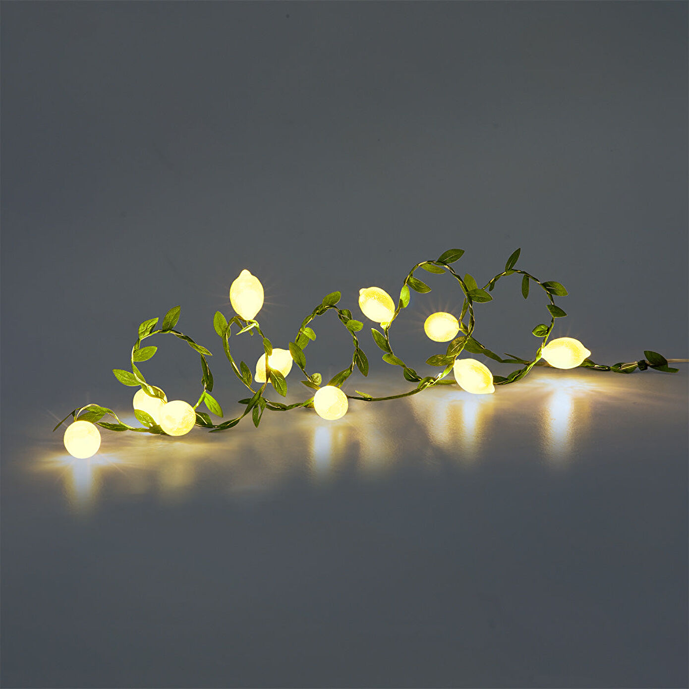 Sarı Limon Detaylı LED Işık Zinciri ile evinize sıcak ve güneşli bir dokunuş katın. Canlı sarı limonlarla süslenmiş bu ışık zinciri, iç mekanları şık bir şekilde dekore etmek için mükemmeldir. Her zincir 1,5 metre uzunluğunda ve 10 LED ışık içerir, eşit aralıklarla yerleştirilen ışıklar, aynalar, yatak başlıkları veya raflar gibi alanlara sarmak için ideal boyuttadır.