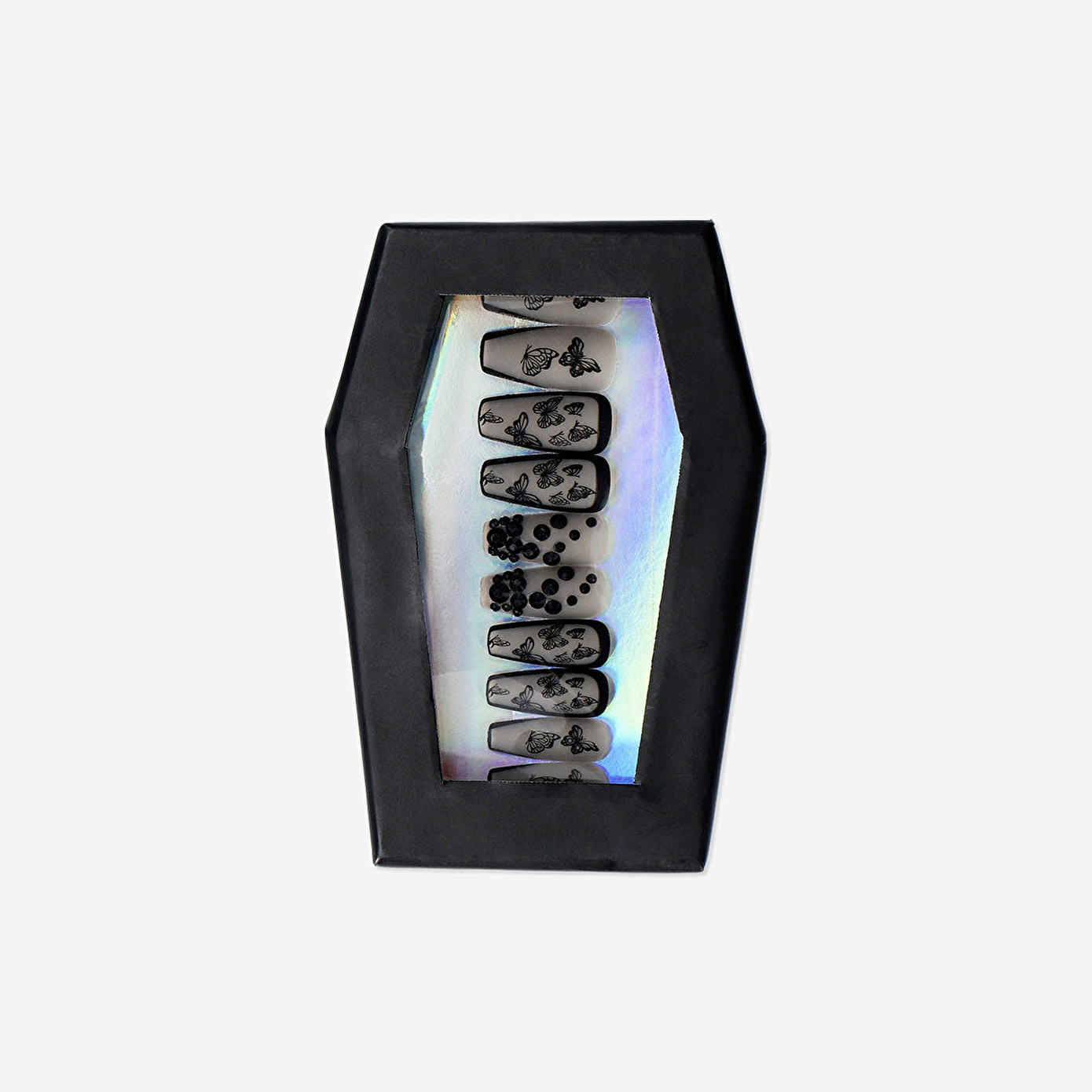 Tabut şeklindeki tematik kutusunda sunulan Siyah Güve Şeklinde 24'lü Takma Tırnak, şık ambalajıyla da öne çıkar ve kendinden yapışkanlı bantları sayesinde kolayca uygulanabilir. Minimum çabayla dramatik bir etki yaratmak için tasarlanan bu tırnaklar, partilerde, özel etkinliklerde ya da günlük tarzınıza karanlık bir dokunuş eklemek istediğinizde mükemmel bir seçimdir. Parmak uçlarınıza hem ürkütücü hem de zarif bir hava katan bu pratik set, gotik şıklığı sevenler için ideal bir tamamlayıcıdır.