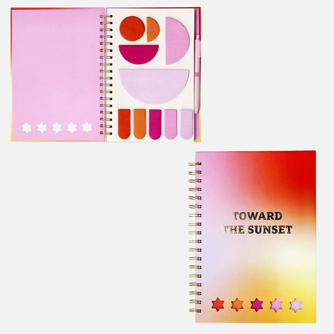 Stickerlı Spiralli B5 Defter, düzenli kalmanız için ideal bir çözüm sunar. Altın harflerle süslenmiş çok renkli degrade kapak, kırtasiye malzemelerinize cesur ve motive edici bir dokunuş katar. 17,5 x 25 x 1,7 cm boyutlarında olan bu defter, geniş yazma alanı sunarak not alma, günlük yazma veya planlama gibi işlemler için mükemmeldir.