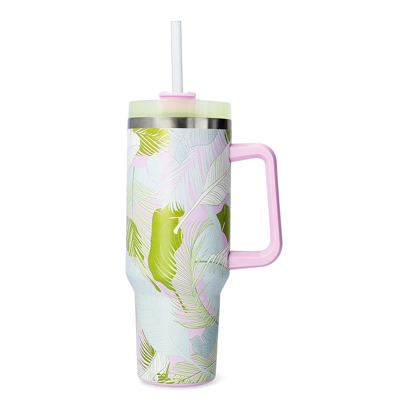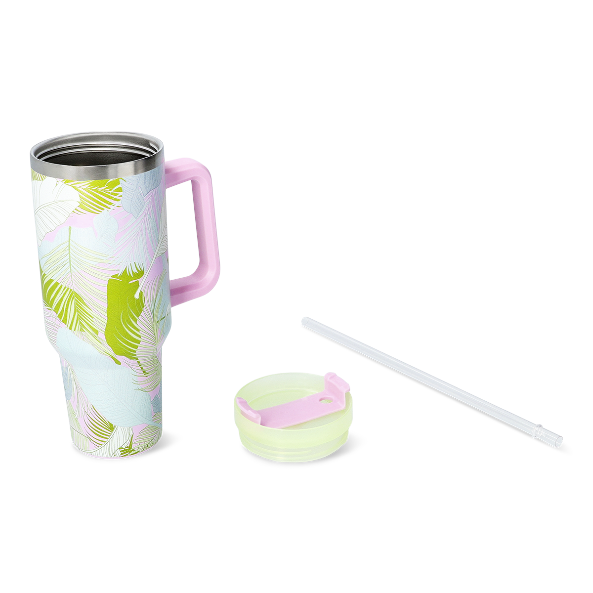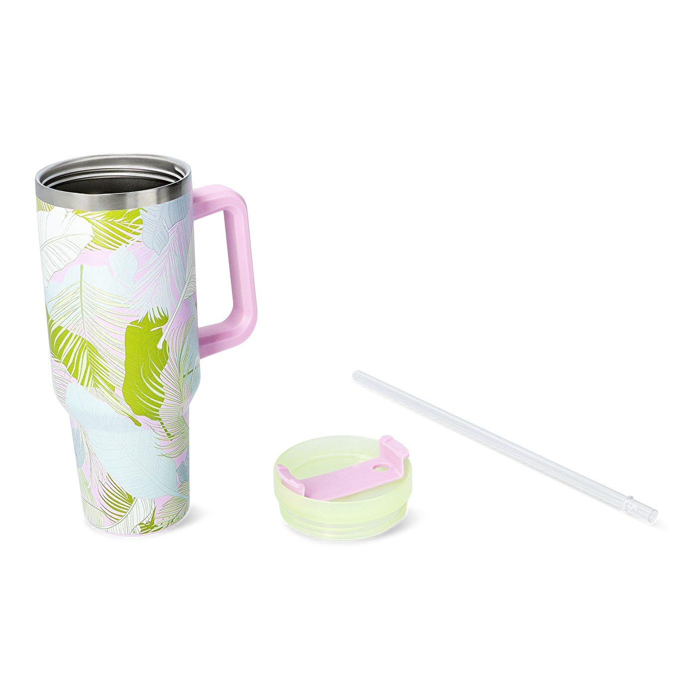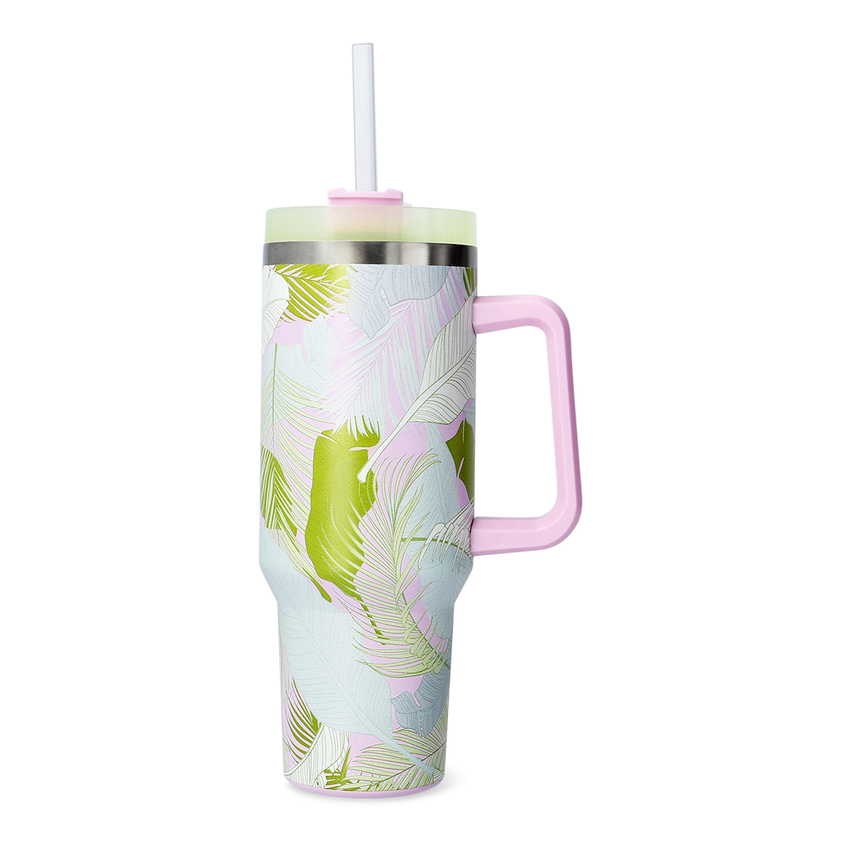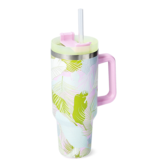 Yeşil Tropikal Desenli Pipetli Paslanmaz Çelik Matara, şık bir görünümle ferahlık hissi sunar. Çarpıcı palmiye yaprağı deseni ile tasarlanan bu bardak, 1200 ml kapasitesi sayesinde uzun iş günlerinde, açık hava etkinliklerinde veya evde dinlenirken kullanabileceğiniz mükemmel bir içecek arkadaşıdır. 14,5 x 27 x 9,5 cm boyutlarında, rahat bir tutuş için tasarlanmış tutma sapına sahip bu bardak, taşıması ve kullanımı son derece kolaydır.