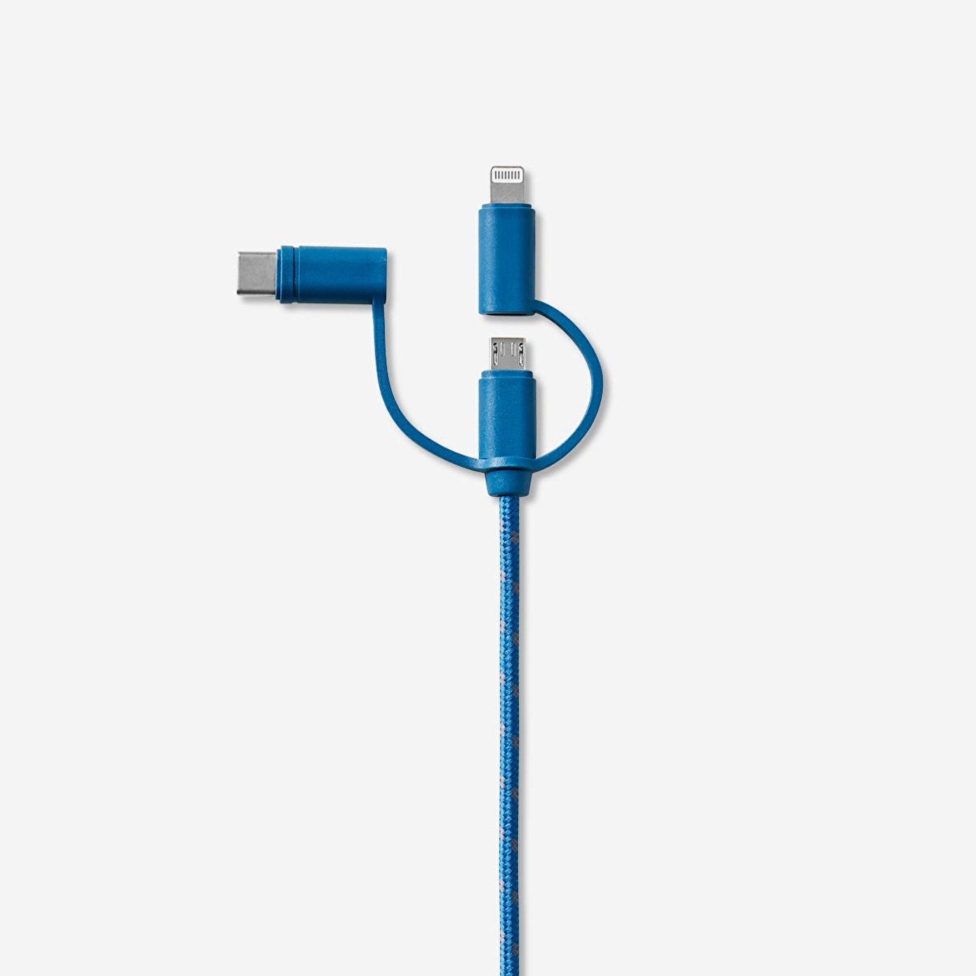 Mavi 3'ü Bir Arada Şarj Kablosu 120 cm, telefonlarınızın pil ömrünü her an korumanız için ideal bir çözümdür. Eski, yıpranmış şarj kablonuzu değiştirmek ya da çantanızda veya arabanızda fazladan bir yedeğe sahip olmak istiyorsanız, bu çok yönlü kablo mükemmel bir seçimdir. USB konektörü ile donatılmış olan bu kablo, iPhone'lar için USB-C, Micro USB ve Lightning konektörleriyle uyumludur, böylece çeşitli cihazlarınızı tek bir kablo ile şarj edebilirsiniz.