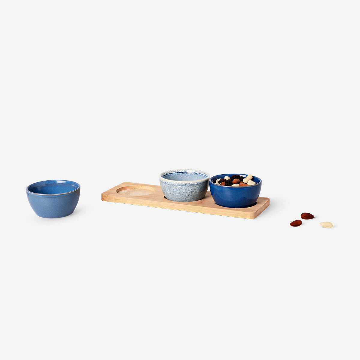 Yemek deneyiminizi bu şık bambu tepsi ve servis kaseleri seti ile arttırın. Set, atıştırmalıklar veya soslar için uygun olan üç seramik kaseden oluşur ve bu kaseler güzel mavi tonlarında tasarlanmıştır. Bambu tepsi 8,1 x 3,9 x 8,1 cm boyutlarındadır ve kaselere doğal ve zarif bir arka plan sağlar. Seramik kaseler hem bulaşık makinesinde yıkanabilir hem de mikrodalgada kullanılabilir, bu da onları günlük kullanım için oldukça pratik hale getirir.