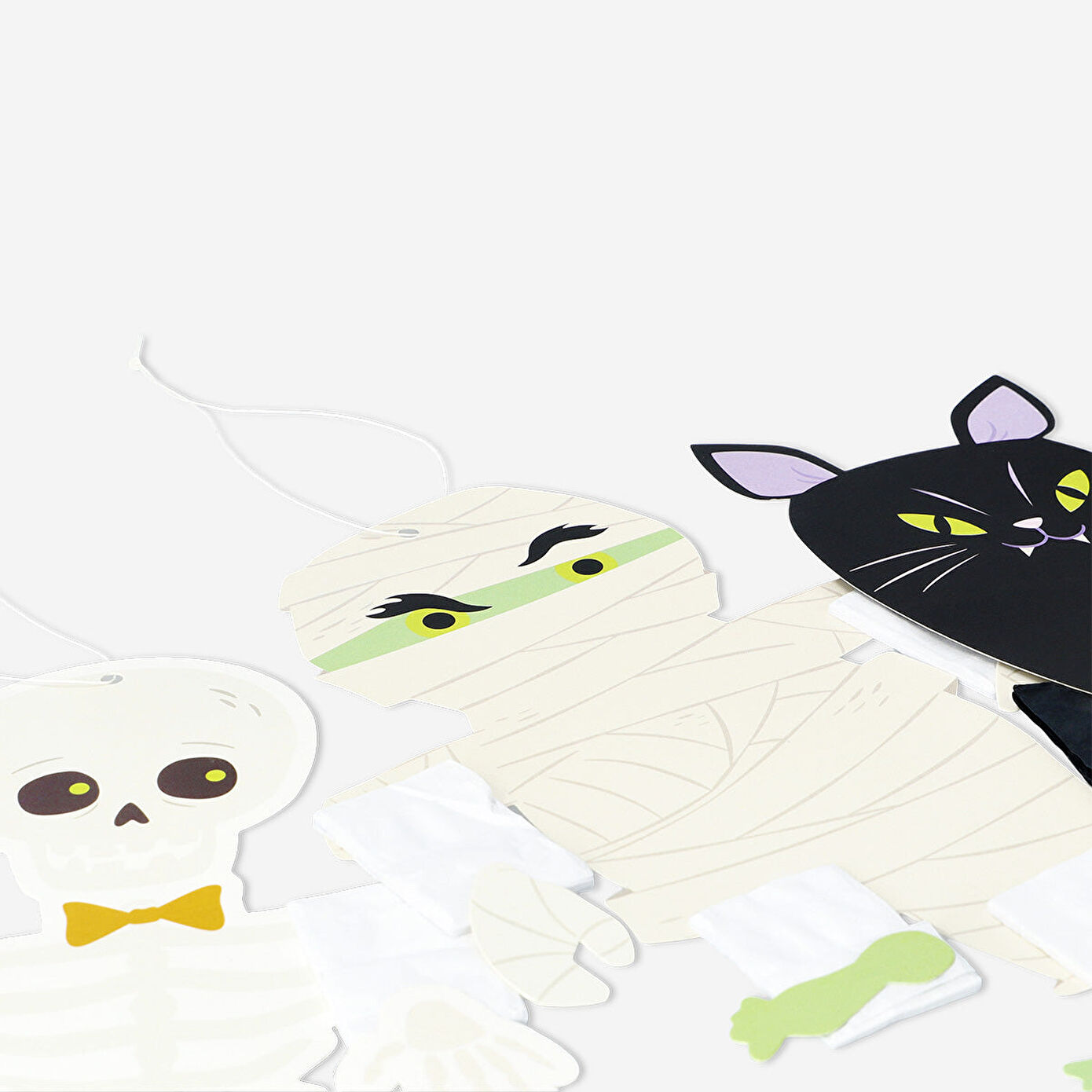 Halloween kutlamalarına hareket katacak bu katlamalı süs seti ile partin daha eğlenceli hale gelir. Set, bir mumya, bir iskelet ve bir siyah kedi figürü içerir. İskelet figürü 11.2 x 18.7 cm boyutlarındadır. Kağıttan yapılan bu karakterler, asılması kolay ve tekrar kullanılabilir özellikte olup, dekorasyonuna hem eğlenceli hem de korkutucu bir hava katar. Kolayca monte edilebilir ve partinde ürkütücü bir atmosfer yaratır. Her türlü Halloween etkinliği için mükemmel bir tamamlayıcıdır!