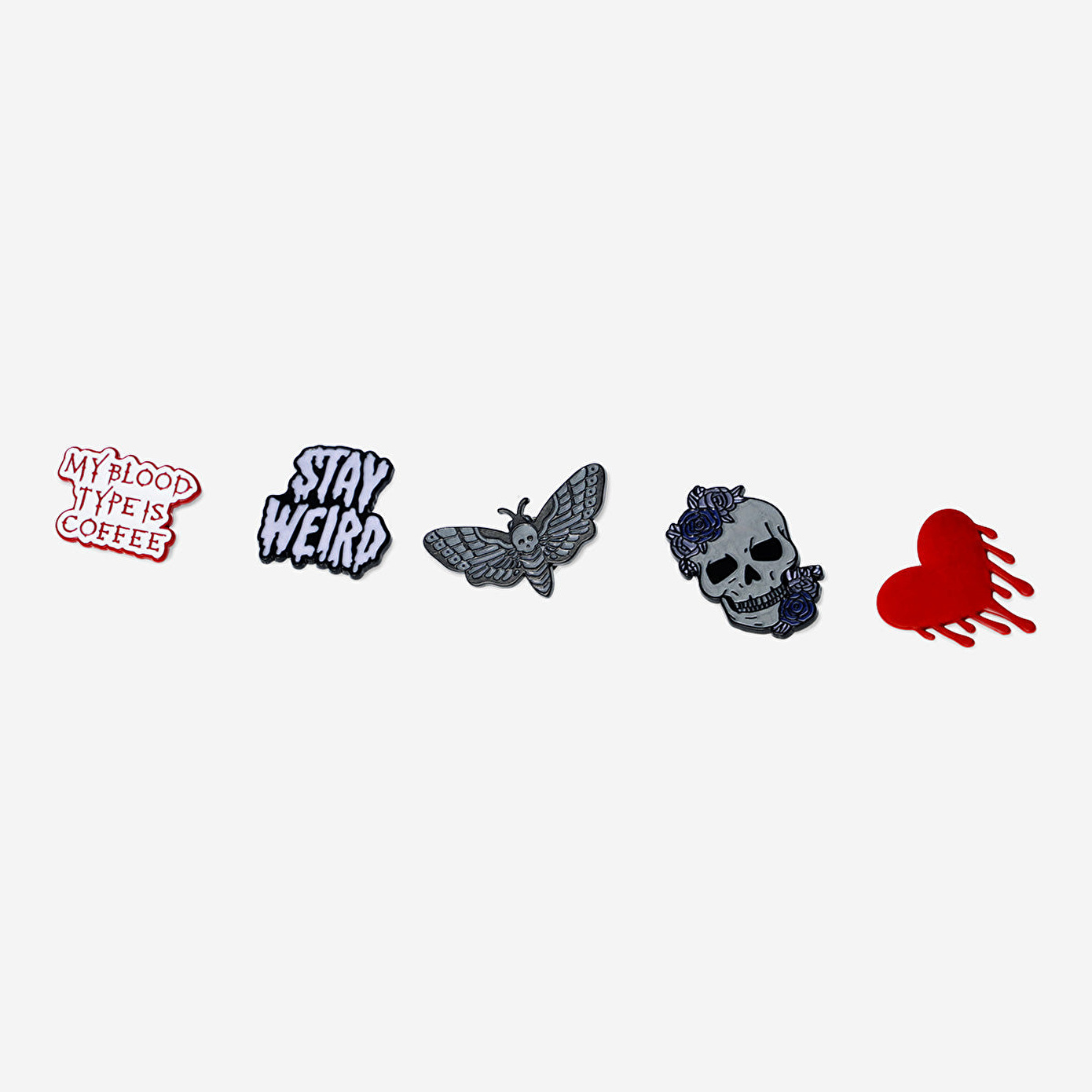 Tarzını cesur bir şekilde yansıtmak istiyorsan, 5'li Gotik Rozet Seti tam sana göre! Bu set, her biri 2.2 x 3.5 x 1 cm ölçülerinde beş şık siyah metal rozet içerir. Kalp, kurukafa ve "Stay Weird" yazısı gibi çeşitli tasarımlarıyla bu rozetler, kıyafetlerine ya da çantalarına gotik bir hava katmak için mükemmel bir seçimdir.