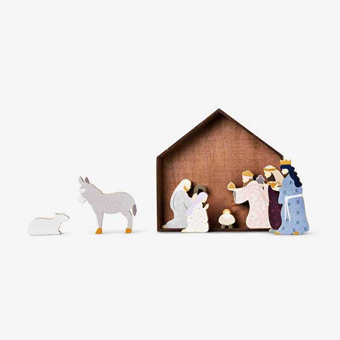 Bu şirin Ahşap Aile Seti ile yılbaşı ruhunu en güzel şekilde kutlayabilirsiniz. 9 parçadan oluşan bu set, kutsal aileyi, bilginleri, çobanları ve hayvanları tasvir eden zarif işçilikle yapılmış ahşap figürlere sahiptir. Set, 18.5 x 17.8 x 4.2 cm boyutlarında bir ahşap ahırla tamamlanır ve bu ahır, yılbaşı dekorasyonunuza şık bir arka plan sağlar.