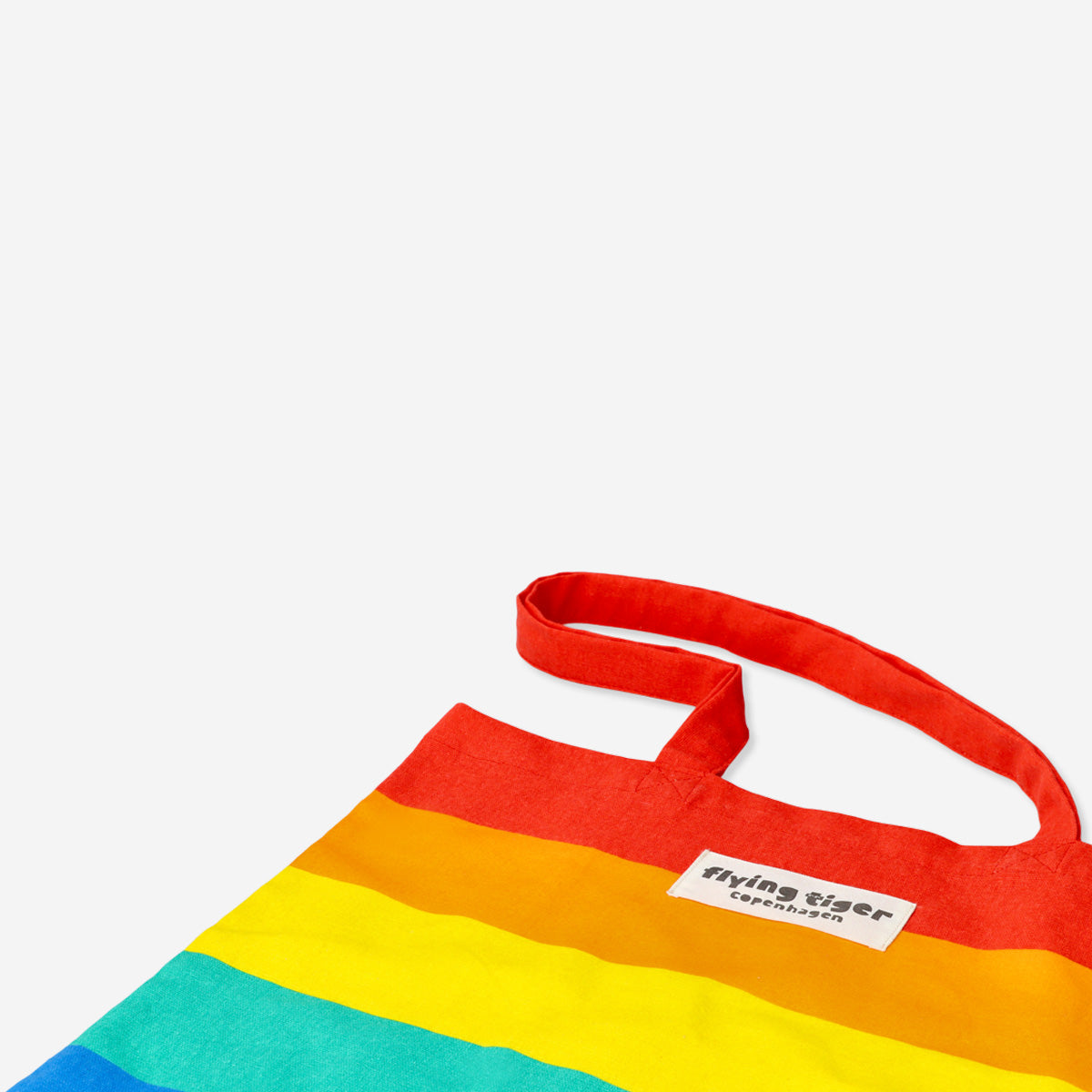Gökkuşağı Bez Çanta, canlı renklerle dolu ve her ortamda göz alıcı bir aksesuar olarak öne çıkan bir üründür. %98 pamuk ve %2 viskon karışımından üretilmiş olması, çantaya hem yumuşaklık hem de dayanıklılık kazandırır. Cesur gökkuşağı çizgileriyle dikkat çeken bu tasarım, gününüze renk katmakla kalmaz, aynı zamanda her kıyafetle uyum sağlar, şıklığınızı tamamlar.