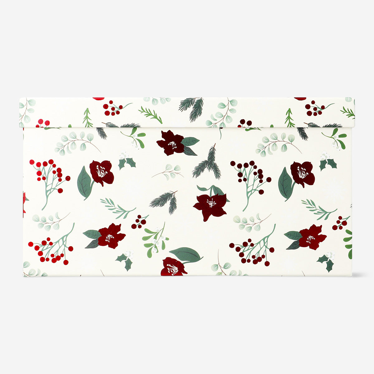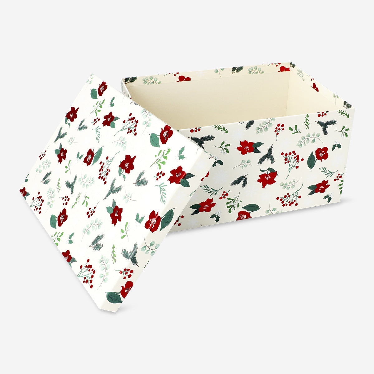Zarif yılbaşı çiçekleri deseni, yılbaşı ruhunu yansıtarak hediyelerinize özel bir dokunuş katar. Yılbaşı ağacının altında hediyelerinizi bu şık ve şenlikli kutu ile öne çıkarın!