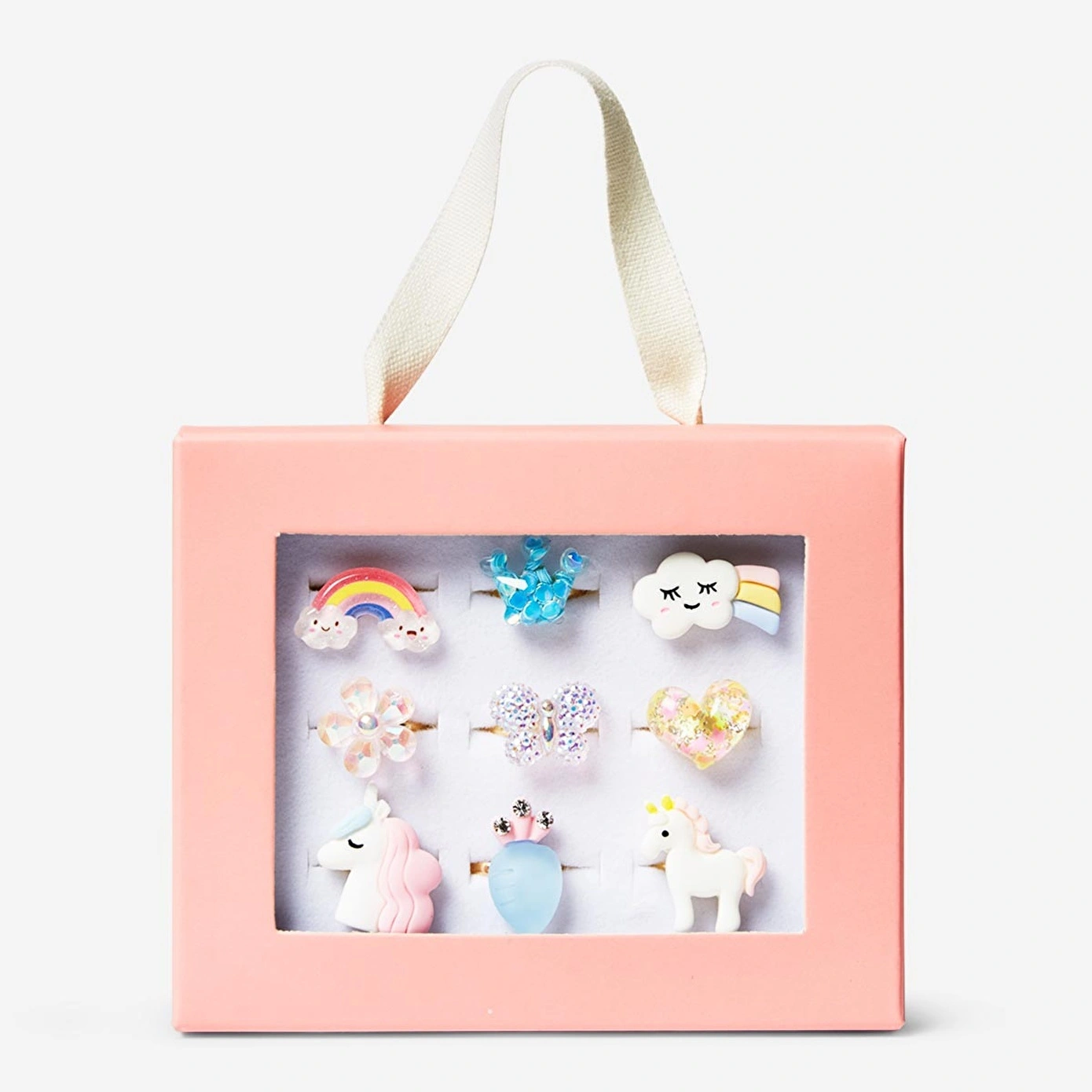 Yüzükler, şeffaf pencereye sahip şirin bir kutuda düzenli olarak paketlenmiş şekilde gelir. Bu kutu, tüm tasarımları bir bakışta görmeyi kolaylaştırır ve doğum günleri, tatiller veya özel hediyeler için mükemmel bir seçenek sunar. Kutunun üzerinde bulunan kullanışlı tutacak, çocukların koleksiyonlarını rahatça taşımasını ve yüzüklerini düzenli tutmasını sağlar.