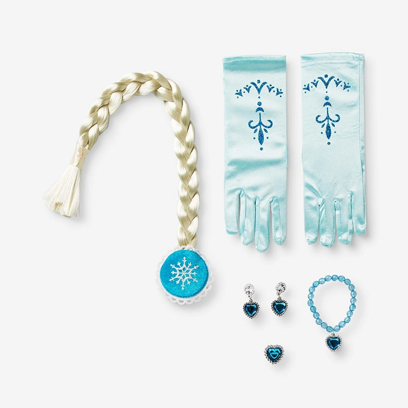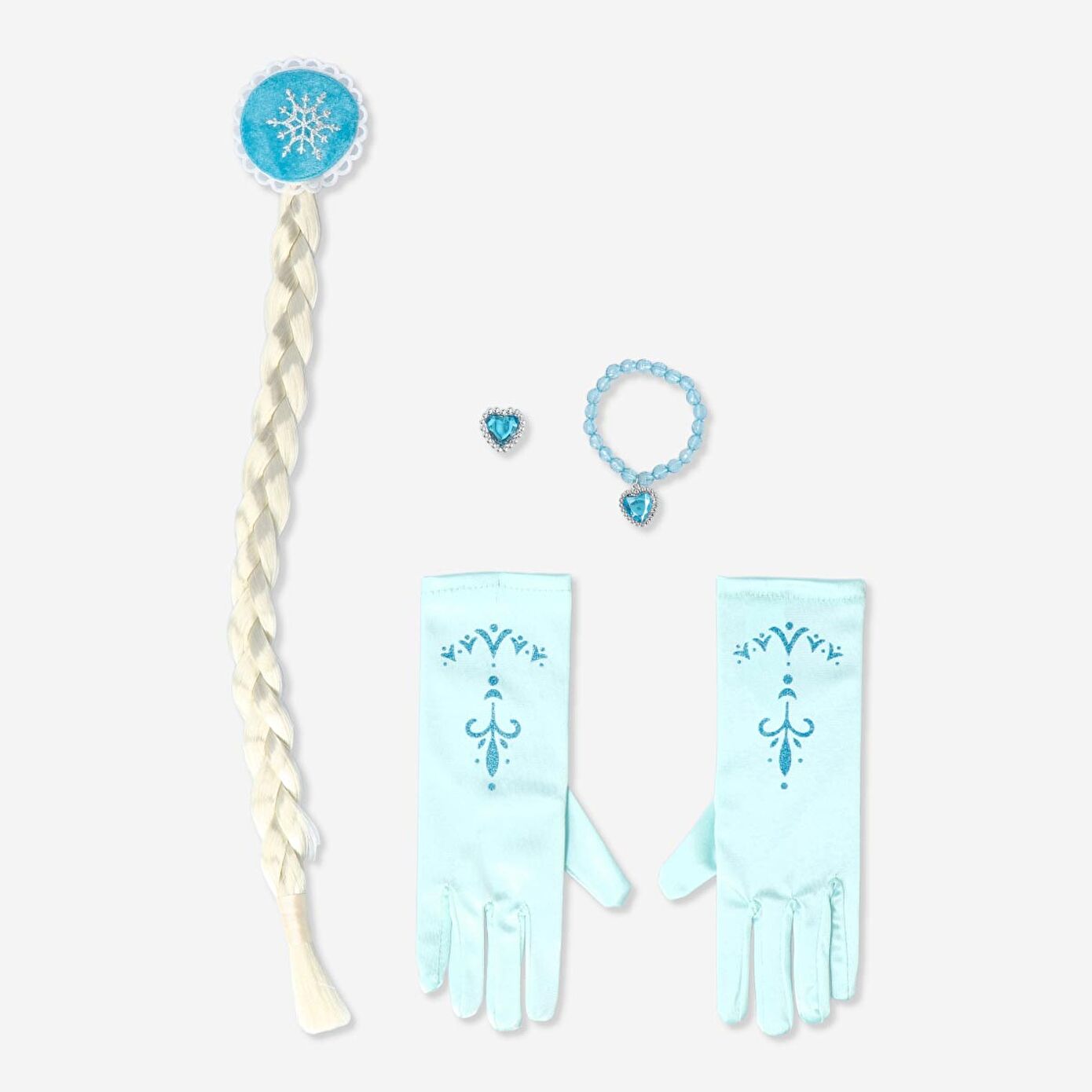 Set, 54,2 x 6,7 cm ölçülerinde örgülü bir saç tokası, eldivenler, küpeler ve bir bilezik içerir. Mavi tonlarda tasarlanan bu aksesuarlar, kostümünüze hem renk hem de eğlence katmak için mükemmeldir.