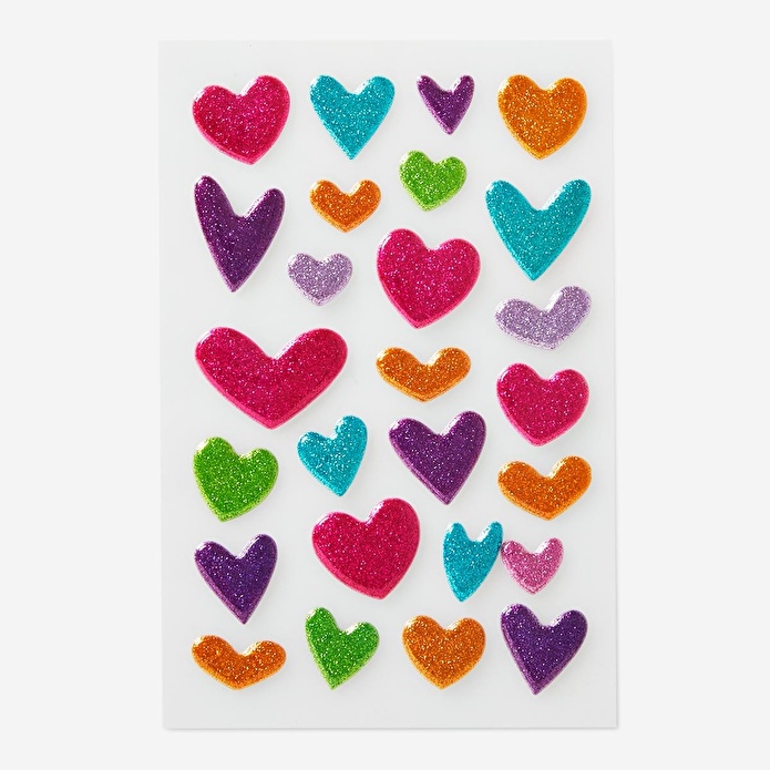 "Projelerinize renk ve eğlence katın! Kalın çıkartmaların yer aldığı bu sevimli sayfa, farklı boyutlardaki canlı kalp şekilleriyle doludur ve defter, scrapbook, kart gibi eşyaları süslemek için mükemmeldir. Kabartmalı tasarımları, projelerinize doku ve boyut katarak onları ön plana çıkarır.