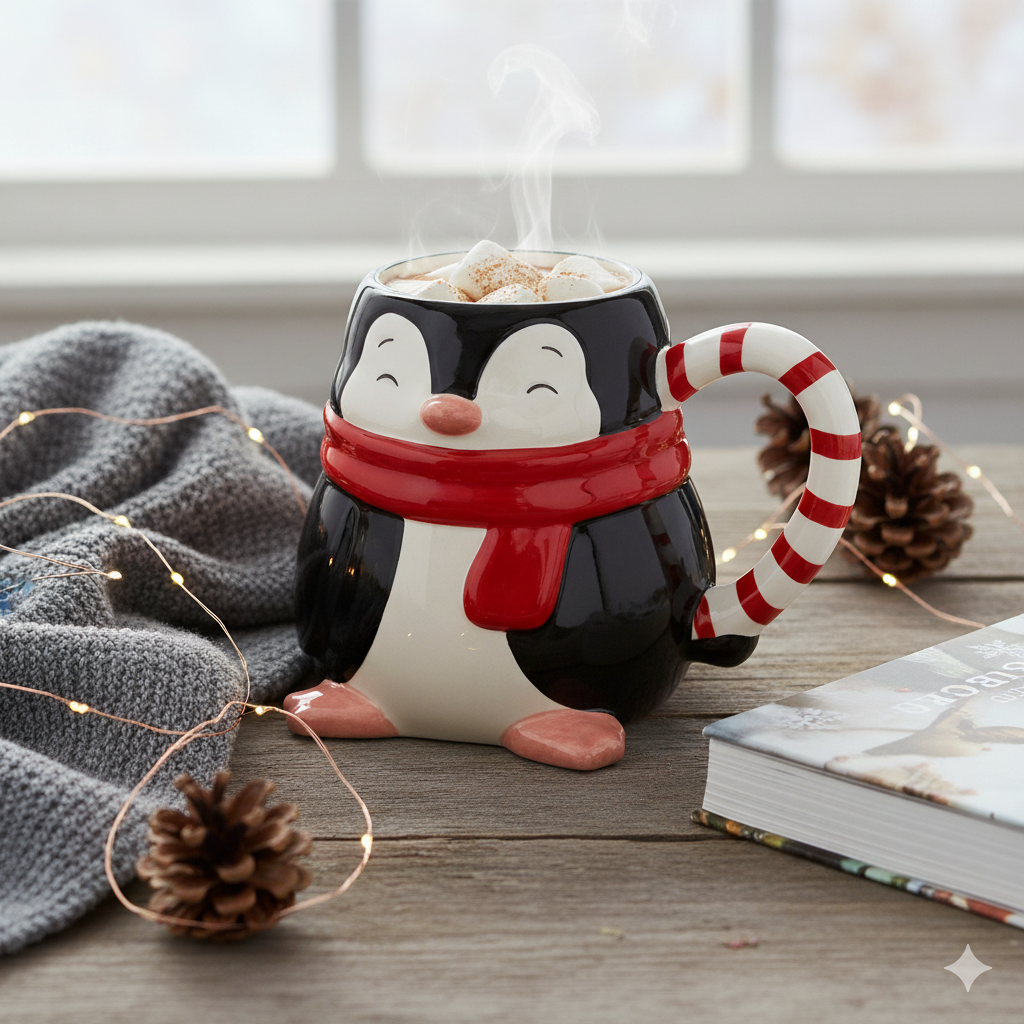 Kışınızı bu sevimli penguen kupasıyla ısıtın. Seramikten üretilen bu çok renkli kupa, kırmızı atkı ve sapıyla tamamlanmış sevimli bir penguen şeklini taşır. 13 x 10,4 x 9,8 cm boyutlarında ve 380 ml kapasiteye sahip olan bu kupa, tatil sezonunda favori sıcak içeceklerinizi keyifle içmek için idealdir.