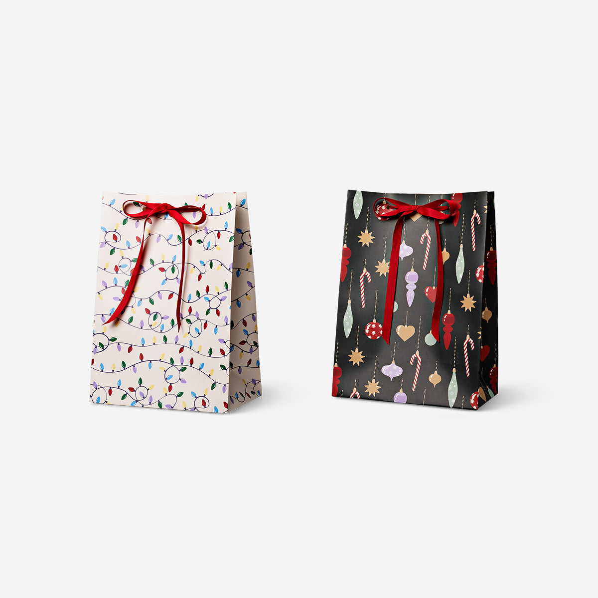 Yılbaşı hediyelerini şık ve eğlenceli bir şekilde sunmak için bu kurdeleli hediye çantaları harika bir seçim! Yılbaşı desenleriyle süslenen her iki çanta, 25 x 18 cm boyutlarındadır ve farklı boyutlardaki hediyeler için idealdir. Set içinde iki adet çok renkli kağıt çanta bulunur; biri klasik kırmızı-beyaz çizgili, diğeri ise süs topları, şeker kamışları ve ışıklar gibi neşeli bir yılbaşı deseni ile dekore edilmiştir. Her çanta, kolayca kapatman için birer kurdeleyle gelir.