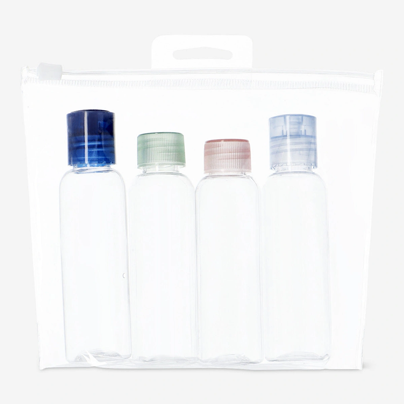 4'lü Renkli Seyahat Şişesi Seti, 13,5 x 17 x 3,3 cm boyutlarında şeffaf bir fermuarlı çantada sunulmaktadır. Şişeler çeşitli renklerde olup, kişisel bakım ürünlerinizi hızlıca tanımlamanızı sağlar. 60 ml kapasiteli şişeler, şampuan, losyon veya dezenfektan gibi ürünleri taşımak için idealdir. Seyahat düzenlemelerine uygun olarak tüm ihtiyaçlarınızı yanınıza almanızı sağlar.