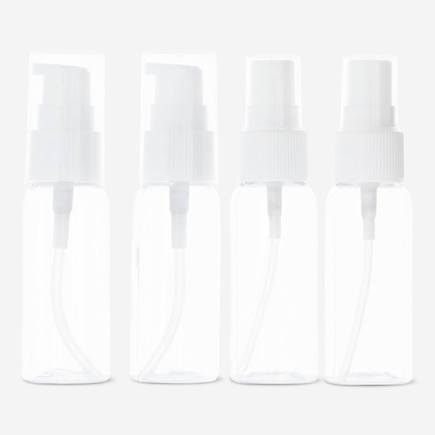 Spreyli Beyaz Seyahat Şişesi Seti, 30 ml kapasiteye sahip 4 adet şeffaf sprey şişesi içerir ve 14 x 15,8 x 3,7 cm boyutlarındaki şeffaf bir çantada saklanır. Şişelerin şeffaf gövdesi, içeriği hızlı bir şekilde tanımlamanızı sağlar.
