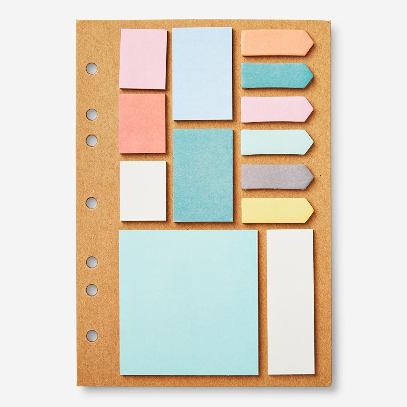 Yapışkanlı Not Kağıdı Seti, notlarınızı düzenli ve erişilebilir tutar. Bu set, çeşitli renk ve boyutlarda yapışkan not kağıtları içerir ve yan tarafında delikler bulunan kullanışlı bir sayfada düzenlenmiştir, bu sayede spiralli dosyalarda kullanılabilir.
