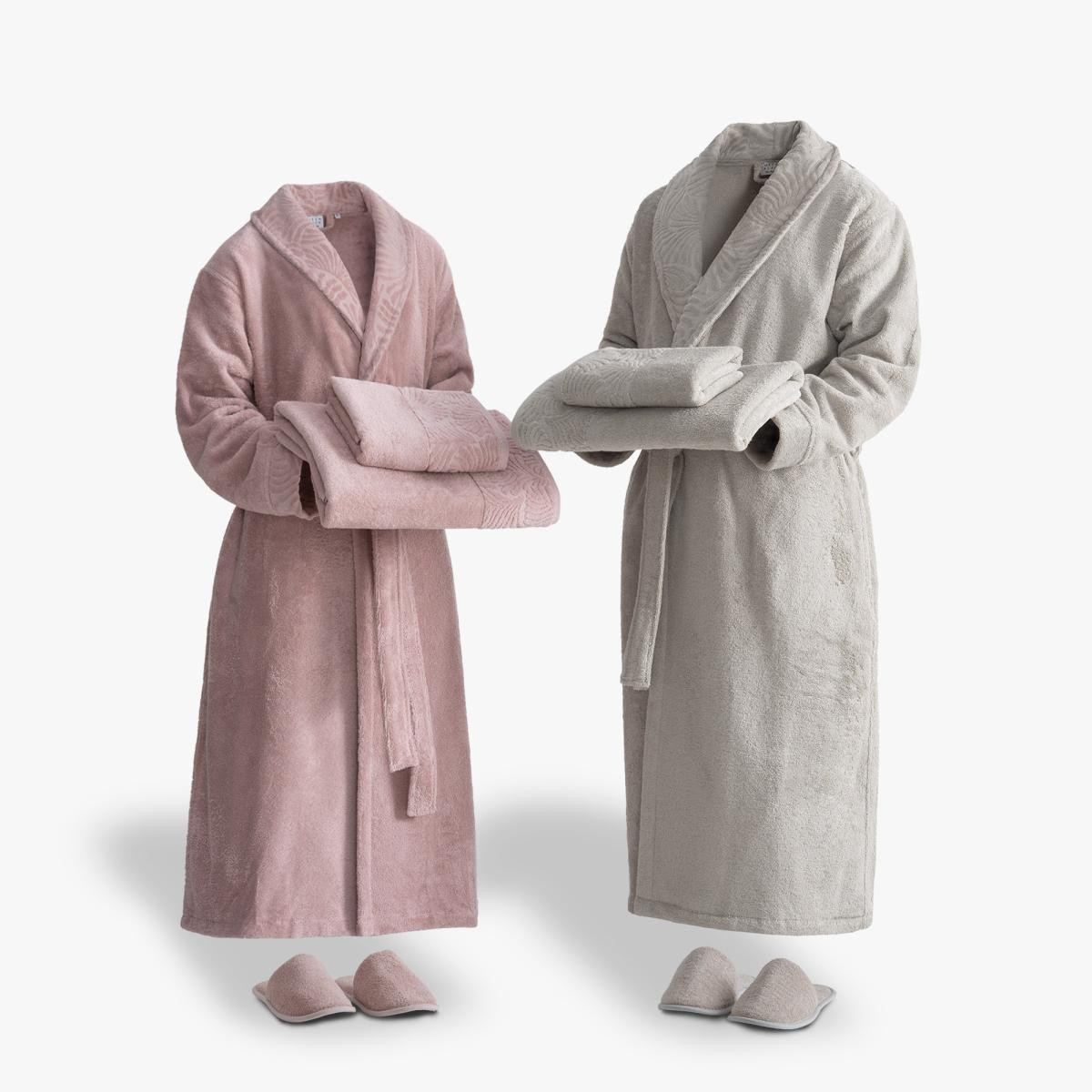 Fiorina %100 Ege Pamuğu Aile Bornoz Seti; yüksek emiciliği, hafifliği ve hızlı kuruma özelliğiyle günlük kullanımda büyük rahatlık sunar. Şal yaka üzerindeki jakarlı dokuma detayları, tasarıma zarif bir dokunuş katar. Kadın ve erkek bornozları, modern çizgileriyle banyodan spa alanlarına kadar her ortamda şıklık ve konforu bir arada sunar. Takımda yer alan havlular, üstün dokuma kalitesiyle cildinize nazikçe temas ederken, terlikler seti tamamlayan zarif bir detay oluşturur.