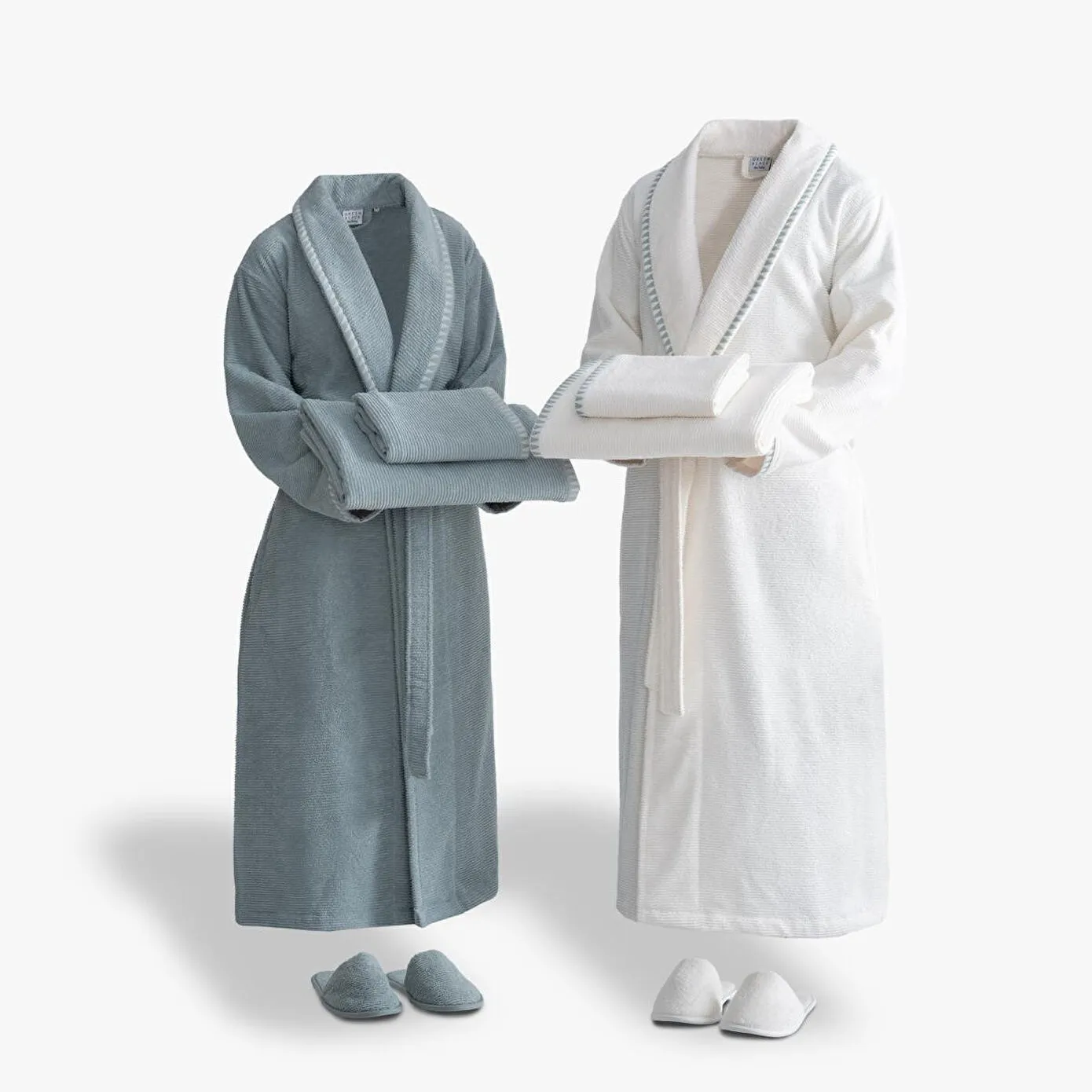 Tria %100 Ege Pamuğu Aile Bornoz Seti; zarif jakarlı şal yaka ve kol manşet detaylarıyla minimal bir şıklık sunarken, yüksek emiciliği ve hafifliğiyle günlük kullanımı konforlu hale getirir. Cildinize nazikçe dokunan dokusu, hızlı kuruma özelliğiyle pratiklik sağlar. Modern çizgileri ve işlevselliğiyle öne çıkan Tria bornozları, banyo keyfinden spa atmosferine kadar her ortamda zarafet ve kaliteyi bir araya getirir. Takımda yer alan havlular ve terlikler, setin bütünlüğünü tamamlayarak banyonuza uyumlu bir görünüm kazandırır.