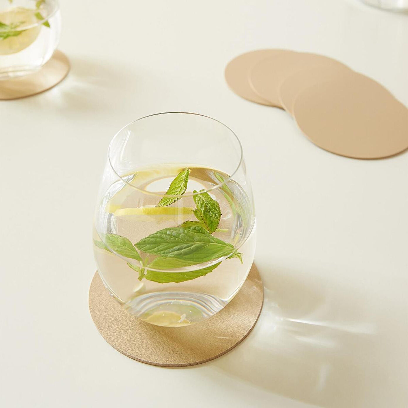 Suni deri bardak altlığı çift taraflı kullanıma uygundur. Aynı malzemeden üretilen amerikan servisi ile kombinlenebilir.