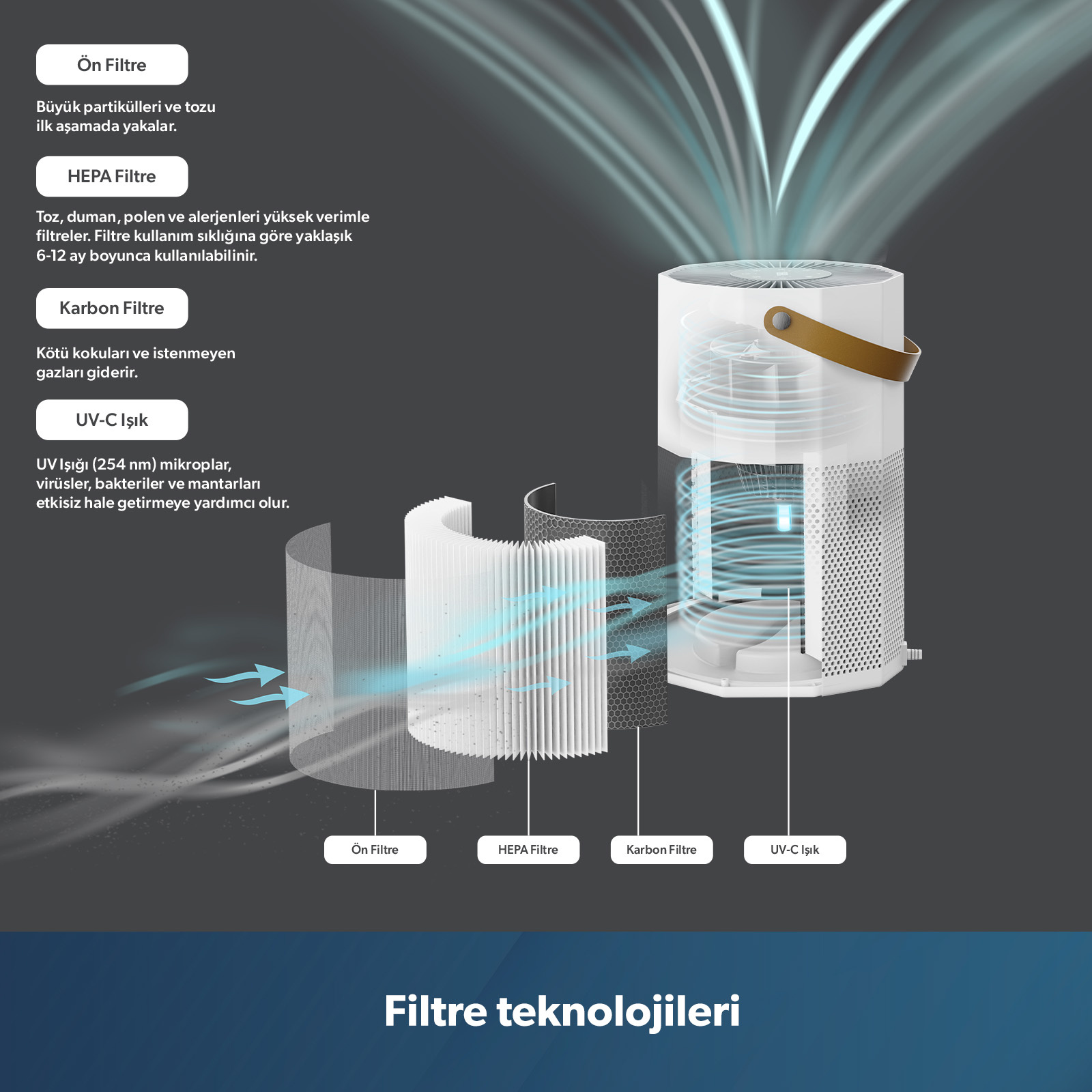 - Filtreleme Sistemi: Ön Filtre + HEPA + Aktif Karbon + UV-C + İyonizer