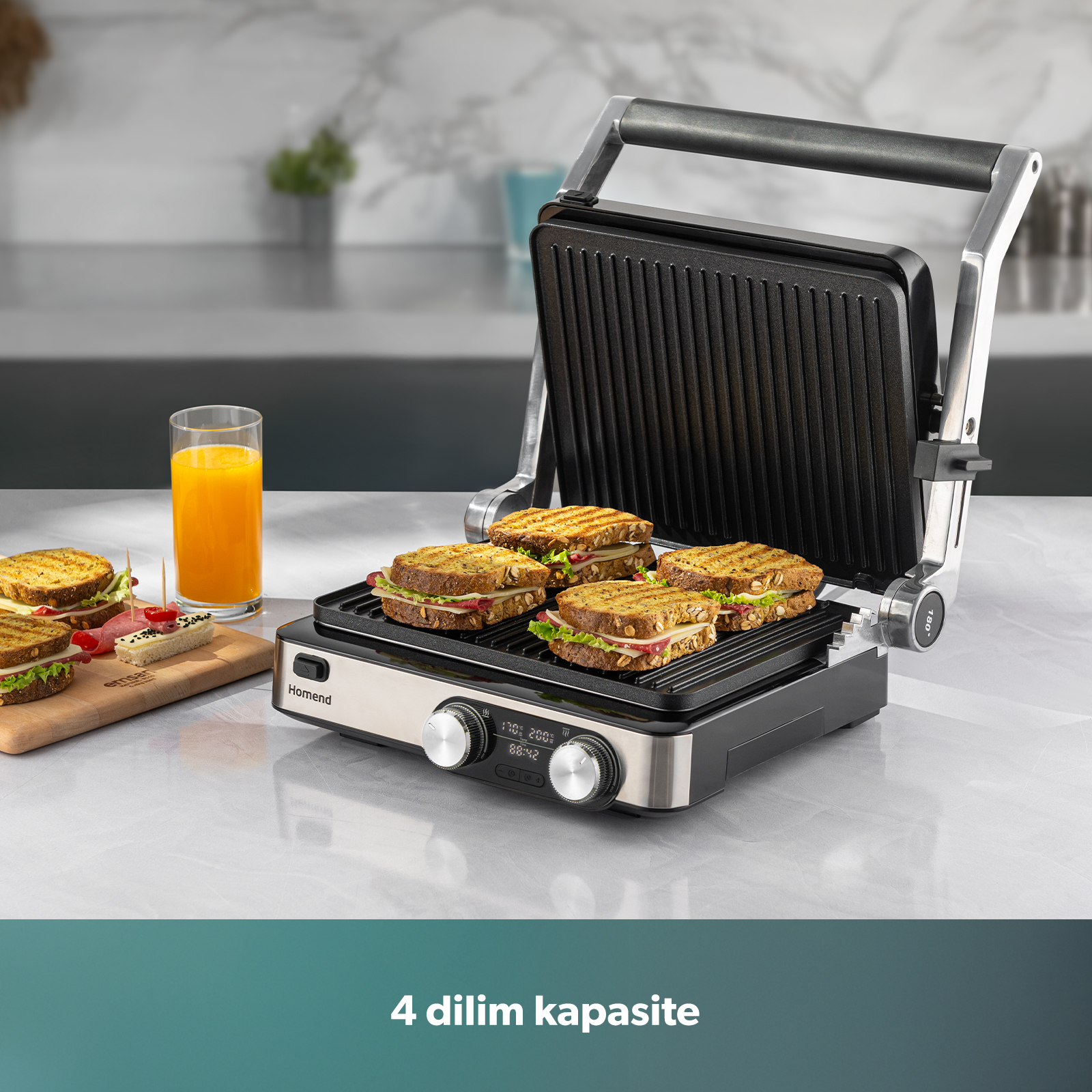 Homend Grilliant 1340H 4 Dilim Kapasiteli Gövde Alt ve Üst Sıcaklığı Ayrı Kontrol Edilebilen Döküm Plakalı Tost ve Izgara Makinesi Inox 2000W