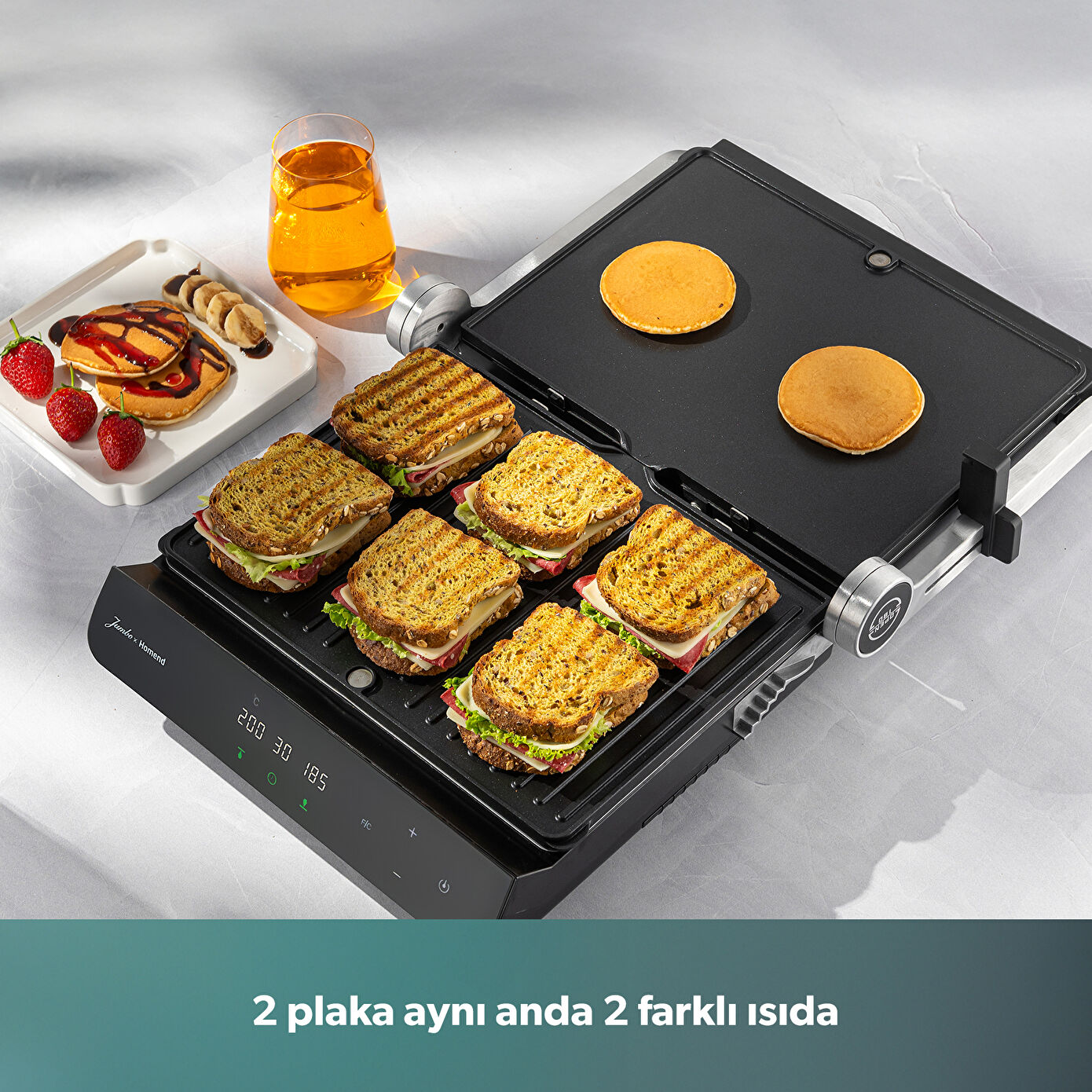 Çift taraflı kullanılabillen döküm plakalar sayesinde tost, hamburger, sıcak sandviç, yumurta ve ızgara yapabilirsiniz.