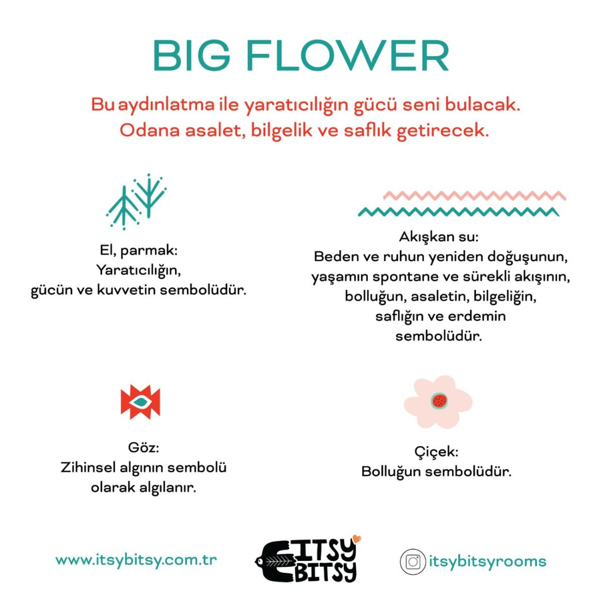 ItsyBitsy Kids Kitolian serisi, Anadolu desenlerinin çocuk ruhuna uygun modern yorumlarıyla odalarınıza neşe, bereket, yaratıcılık, güç ve pozitif enerji getirir. Çocuk ve bebek yaşam alanlarını tasarlarken, doğru aydınlatmayı seçmek odanın temasını tamamlamanın en önemli unsurlarından biridir. Pembe tonlarındaki Big Flower Tavan Aydınlatması, hem göz alıcı tasarımıyla hem de sıcak renkleriyle odalara sıcacık bir atmosfer kazandırır. Ürün Özellikleri: • Neşeli ve Canlı Renkler: Big Flower Tavan Aydınlatması, pembe rengi ve özenle tasarlanmış formu ile çocuk odalarına eğlenceli bir dokunuş yapar. • Anadolu Esintileri: Çocuk ruhuna uyarlanmış Anadolu desenleri, odalara özel bir karakter kazandırır. • Yaratıcı ve Stil Tamamlayıcı Işık: Stil sahibi bu aydınlatma, odanın dekorasyonunu tamamlarken çocuğunuzun yaşam alanına yaratıcılık katar. • El Yapımı Tasarım: ItsyBitsy'nin her bir aydınlatması, el işçiliği ile üretilmiştir ve her parça kendine özgü bir dokunuşa sahiptir. Kombinleme İmkanları: • Uyumlu Halı ve Nevresim Takımları: Aynı temaya sahip halı ve nevresim takımları ile odanın dekorasyonunu tamamlayın. • Mix & Match Seçenekleri: Farklı desenleri karıştırarak çocuğunuzun odasında eğlenceli ve yaratıcı kombinasyonlar oluşturabilirsiniz. • Modüler Mobilyalar: ItsyBitsy Kids koleksiyonundaki el yapımı mobilya takımları, halı, nevresim ve aydınlatmalarla uyum içinde kombinlenebilir. Teknik Özellikler: • Boyutlar: 40 cm x 22 cm x 40 cm (en x boy x derinlik) • Ağırlık: 400 gr • Ampul Cinsi: E27 (Ampul dahil değildir) • Maksimum Watt: 40 Watt LED ampul ile kullanıma uygundur. Kullanım ve Bakım Talimatı: • Ürün montajını mutlaka yetkili kişilere yaptırınız. • Etikette yazan voltajın bulunduğunuz yerin voltajına uygun olduğundan emin olunuz. • Yetersiz akım sağlayan uzatma kablolarını kullanmayınız. • Montaj esnasında elektrik akımını devre dışı bırakınız. • Temizleme işlemi öncesinde ürünün tamamen soğuduğundan emin olun. • Temizlik için yumuşak, nemli ve temiz bir bez kullanın; asla aşındırıcı malzemeler veya kimyasallar kullanmayınız. • Ürünü suya daldırmayınız. Big Flower Tavan Aydınlatması ile çocuk odalarına sadece ışık değil, sıcaklık ve güvenli bir atmosfer kazandırın!
