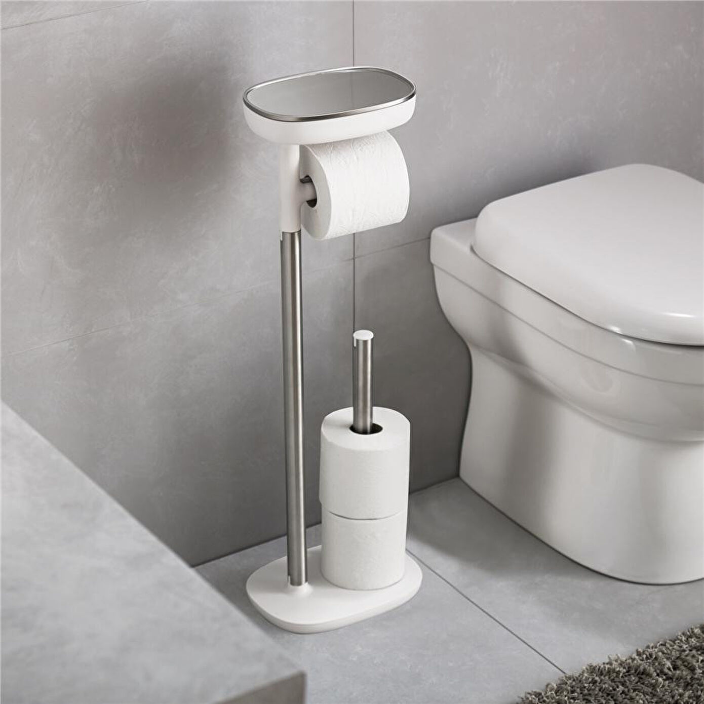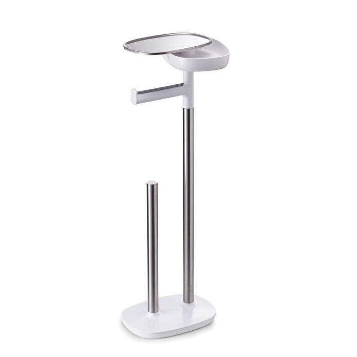 Bu ayaklı tuvalet kağıtlığın çift amaçlı bir rafı da var. Paslanmaz çelik yüzeyin üzerine cep telefonu veya kitap gibi şeyler koymak mümkün, altından açılan çekmece ise hijyenik ürünleri elinizin altında ama gözden uzakta bulundurmak için düşünüldü. Tutacağın silikon şeridi kağıdı yırtmak için gereken direnci sağlar ve rulonun hızlı açılmasını engeller. Tabanındaki ağırlık denge sağlar, rafın parmak izi tutmayan paslanmaz çelik kaplaması ise kolaylıktır.
