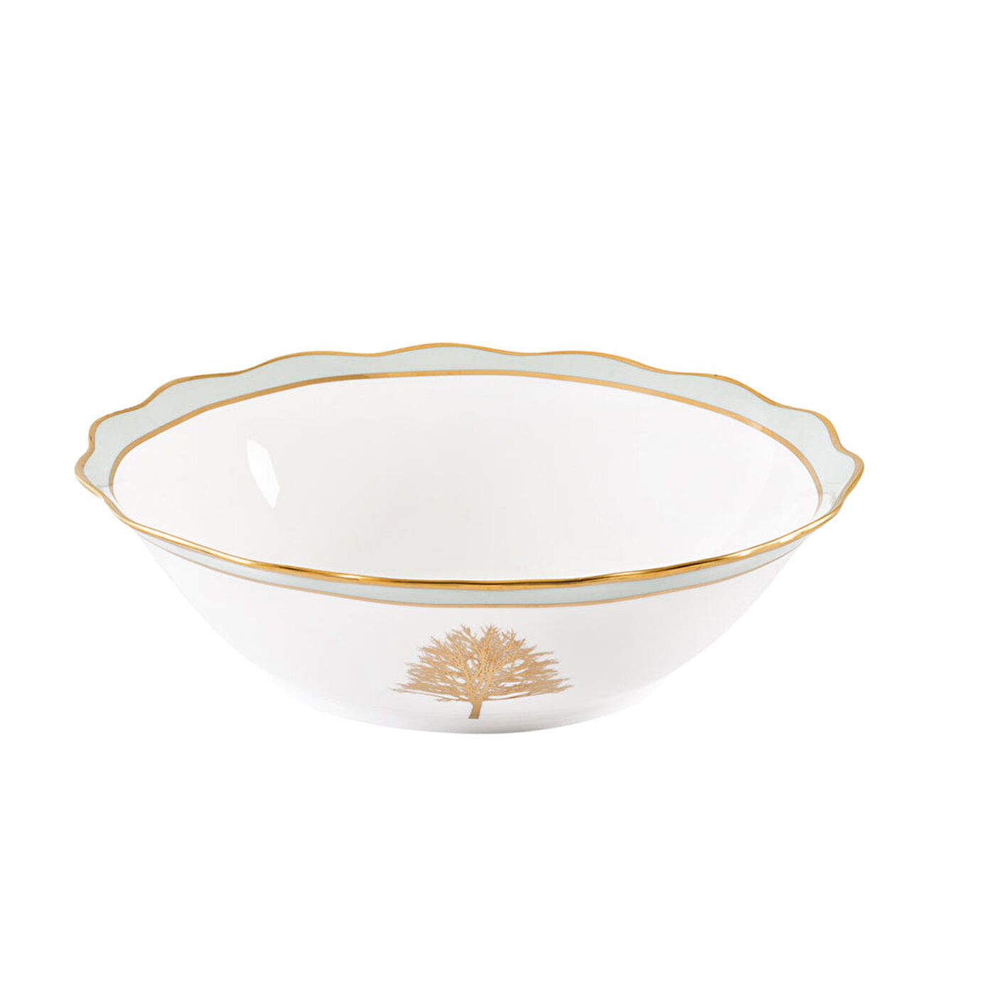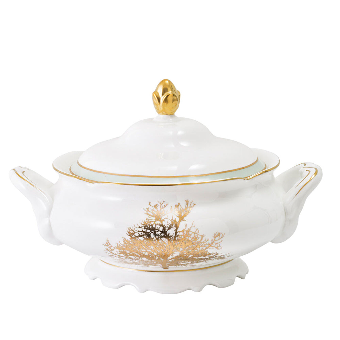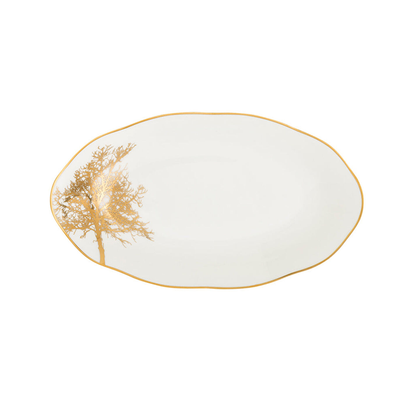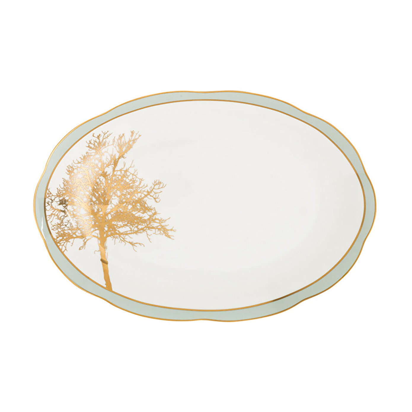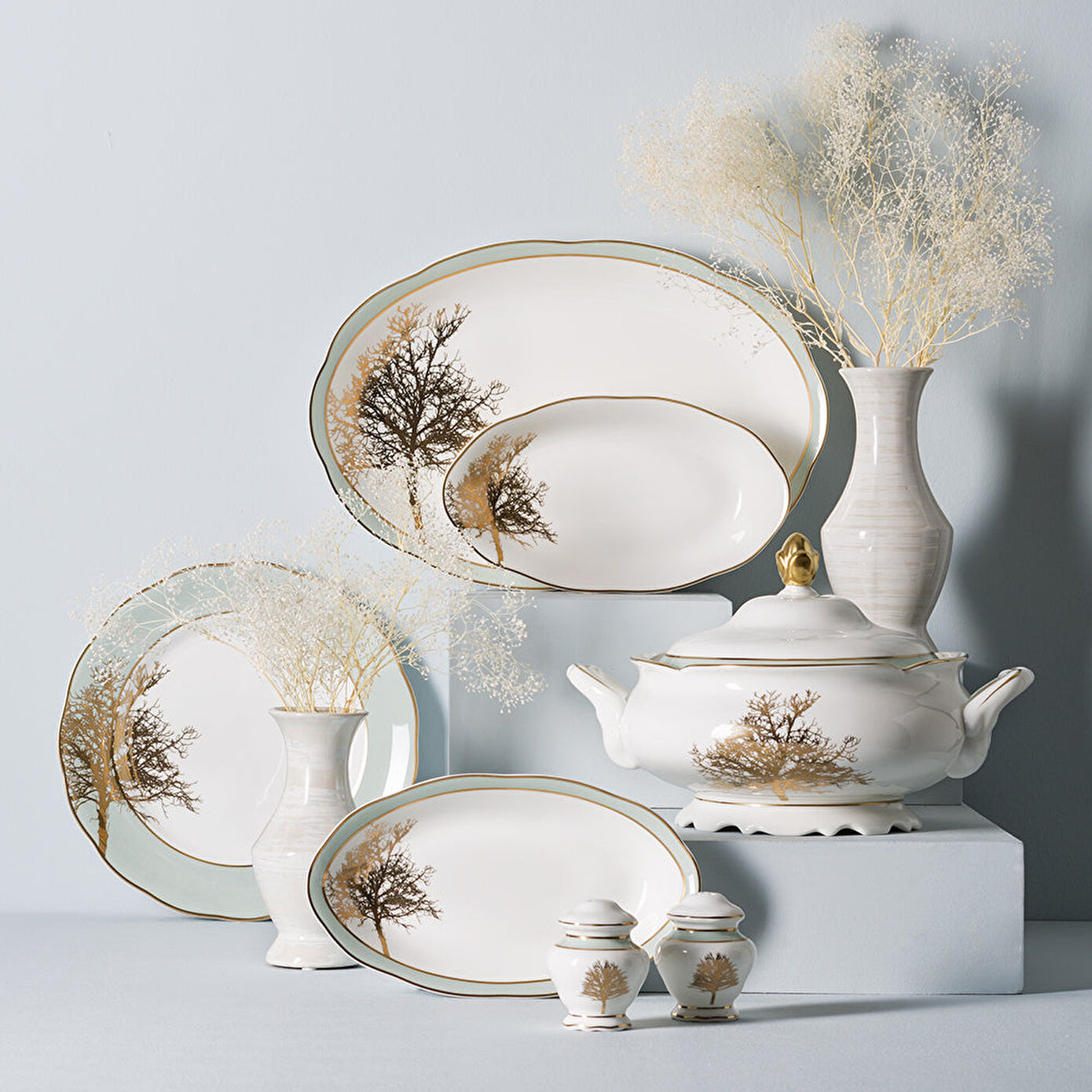 Daphne 12 kişilik yemek takımı altın rengi ve desenleri ile akılda kalıcı bir tasarım vadediyor. Takımı oluşturan parçalar, altın renkli hoş dokunuşlar ile süslenerek son derece estetik bir havaya ulaşıyor. Goldun son derece zarif ve hoş tonları ile süslenen takım, ayrıca ağaç desenleri ile de kendine has bir görünüme bürünüyor. Hem çerçeve bölümü hem de kenarda konumlanan ağaç desenlerinin altın oluşu, takıma aynı zamanda bir ihtişam katıyor. Böylelikle şaşaalı ve gösterişli sofralarınızın favorisi Daphne 12 kişilik yemek takımı olabilir. Yuvarlak ve oval formların hüküm sürdüğü yemek takımında ağaç deseni olmayan, yalnızca gold ince kenarlar ile süslü parçalar da var.
