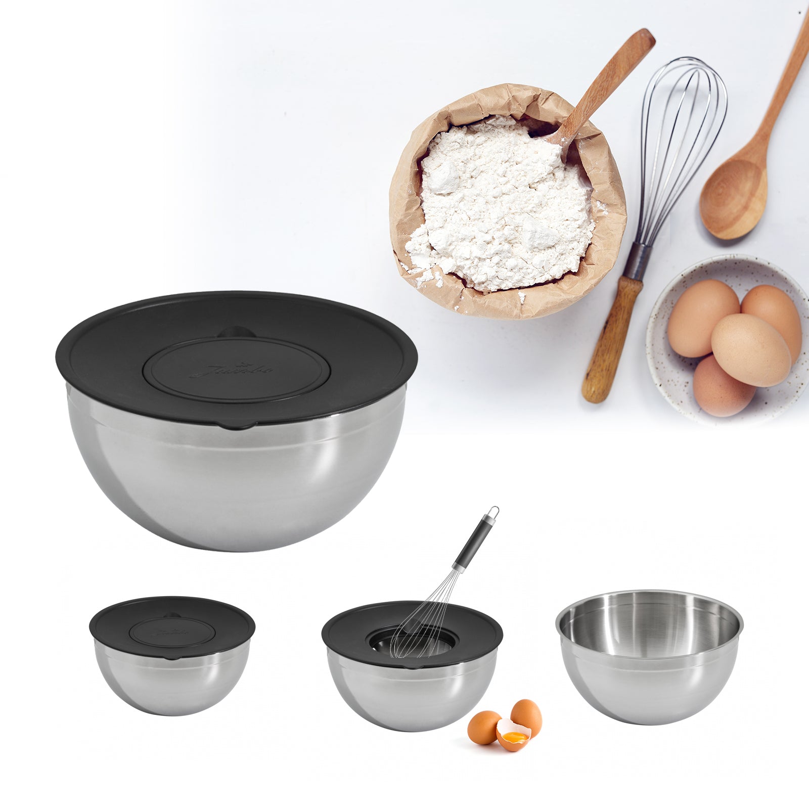 Jumbo Globe 9 parça siyah rendeli karıştırma saklama kabı seti fonksiyonel kullanımıyla sizinle! Üç farklı şekilde kullanılabilen bu kaplar, ihtiyaçlarınıza göre şekilleniyor. İki farklı rende ucuna sahip olan bu ssaklama kabı istediğiniz şekillerde rende yapabilmeyi ve yiyeceklerinizi kap içerisinde karıştırabilmenize imkân sağlıyor. 304 paslanmaz çelikten üretilmiş gövdesiyle yüksek dayanım sunarken, hijyenik yapısı sayesinde kolay temizlenir. Set, farklı boyutlardaki üç saklama kabının yanı sıra iki adet pratik rende içerir; bu rendeler, kapak üzerindeki boşluğa yerleştirilerek kullanım kolaylığı sağlar. Oldukça pratik bir kullanımı bulunan bu kaplar ile işlerinizi kolaylaştırabilirsiniz. İşlevselliğinin yanında şık tasarımı da beğenileri topluyor. Siyah renk ile kaplı olan bu setin iç kısmı orijinal rengi olan çelik olup modern bir görünüme sahip. Dayanıklı ve sağlam yapısı sayesinde renk atma, çizilme veya aşınma durumlarına karşı dirençli. Hamur işi, salata gibi karıştırılması gereken yiyeceklerin hazırlanmasında sıklıkla kullanılan bu kaplar korunaklı kapaklı sayesinde fazla kalan yiyeceklerin veya saklanmasında da kullanılıyor. Yiyeceklerinizi düzenli ve sağlıklı bir şekilde korumak istiyorsanız da Jumbo Globe'yi kullanabilirsiniz. Ayrıca, setin bakımı oldukça pratiktir; bulaşık makinesinde yıkanabilirken, kapaklarının elde yıkanması önerilmektedir. Günlük yaşamınızı kolaylaştırıcı özelliği ile sizlere sunulan bu seti kaçırmadan sepetinize ekleyebilirsiniz.
