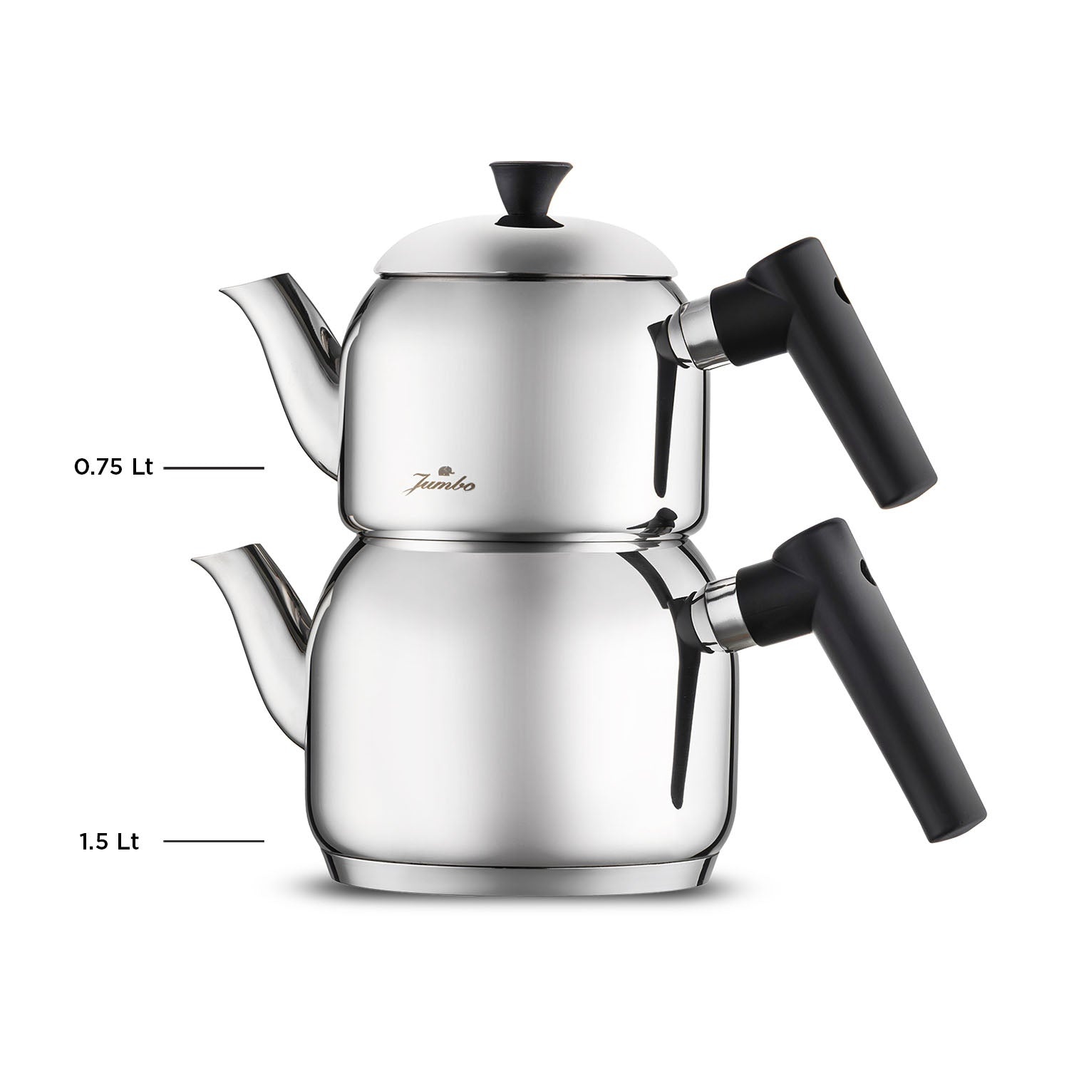 Jumbo Salermo çaydanlık eşsiz tasarımının yanı sıra dayanıklılık konusunda da kullanıcıların beğenisini kazanmayı başarıyor. Bu setin imalatında kullanılan paslanmaz çelik materyali uzun ömürlü kullanım için oldukça ideal. Jumbo Salermo paslanmaz çeliğin getirdiği korozyona karşı dayanıklılıkla uzun süre ışıltısından ödün vermiyor. Bununla birlikte dayanıklı yüzeyi sayesinde lekelenme gibi problemler yaşatmadan pratik bir şekilde temizlenebiliyor. Her çay saatinize ışıltı dolu bir sunumla başlamanız için Jumbo Salermo çaydanlığı tercih edebilirsiniz. Buna ek olarak ürünün bakalit materyalinden üretilen kulpları kullanım konforu iddiasını güçlendiriyor. Sıcak sunulması gereken çay, kaynama noktasında olsa dahi Jumbo Salermo çaydanlığın kulpları elinizi yakmıyor. Sevdiklerinize keyifle ve konforla çay sunumu yapmak için ürünün kalitesine güvenin. Jumbo Salermo 0,75 litre demlik ve 1,5 litre su kapasitesine sahip. Geniş hacme sahip ürünü ister kişisel kullanım ister özel davetleriniz için değerlendirebilirsiniz. Jumbo kalitesinin getirdiği sonsuz ihtişamı yakalamak için hemen Salermo çaydanlığı sepetinize ekleyin!