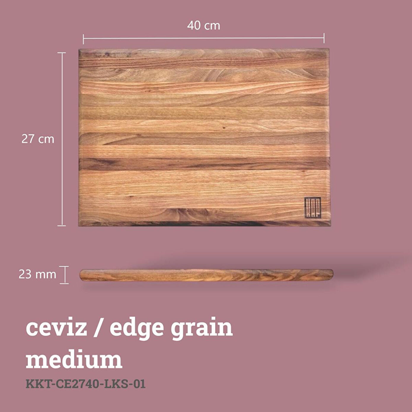 Ceviz Edge-Grain (Yatay Lif) Kesme Tahtası Doğanın zarafetini ve el işçiliğinin titizliğini bir araya getiren bu Ceviz Edge Grain Kesme Tahtası, mutfakta hem estetik hem de sağlam bir dosttur. Ceviz ağacı, kendine özgü sıcak kahve tonları, belirgin damar yapısı ve yoğun dokusuyla dayanıklılığın simgesidir. Her bir tahta, doğanın ellerinden çıkmış gibi benzersizdir. Edge Grain (yatay lif) yapısı, tahtayı bıçak darbelerine karşı dirençli kılar; düzgün yüzeyi ise uzun süreli kullanımlarda formunu korur. Gıda ile temasa uygun doğal yağlarla korunan yüzey, ahşabın gerçek dokusunu hissettirir. El yapımı olarak üretilen her parça, özenle zımparalanır, yağlanır ve son dokunuşlarıyla mutfağınıza sıcak bir karakter kazandırır. Hem kesme hem de sunum tahtası olarak kullanılabilir — sofranıza zarafet, tezgâhınıza doğallık katar.