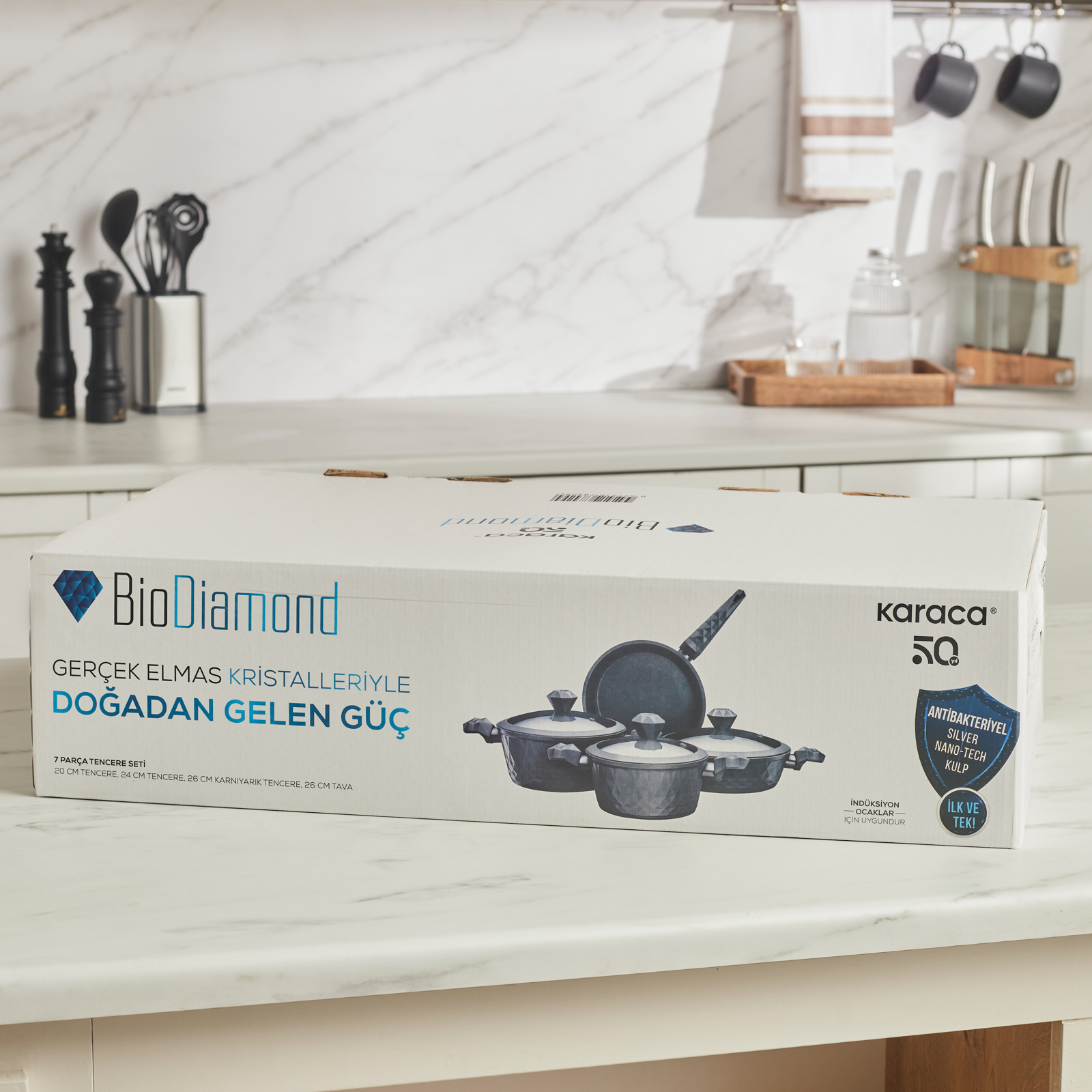 Mutfakta hem sağlıklı hem de uzun ömürlü pişirme ekipmanları arayanların tercihi olan Karaca Bio Diamond Tencere Seti, özel BioDiamond teknolojisi ile geliştirildi. Gerçek elmas kristallerinden ilham alan bu özel yüzey, çizilmelere karşı üstün direnç sağlarken, antibakteriyel kulplarıyla hijyeni ön planda tutar. Az yağ ile pişirme imkanı sunan bu set, lezzetli ve hafif yemeklerin anahtarıdır.