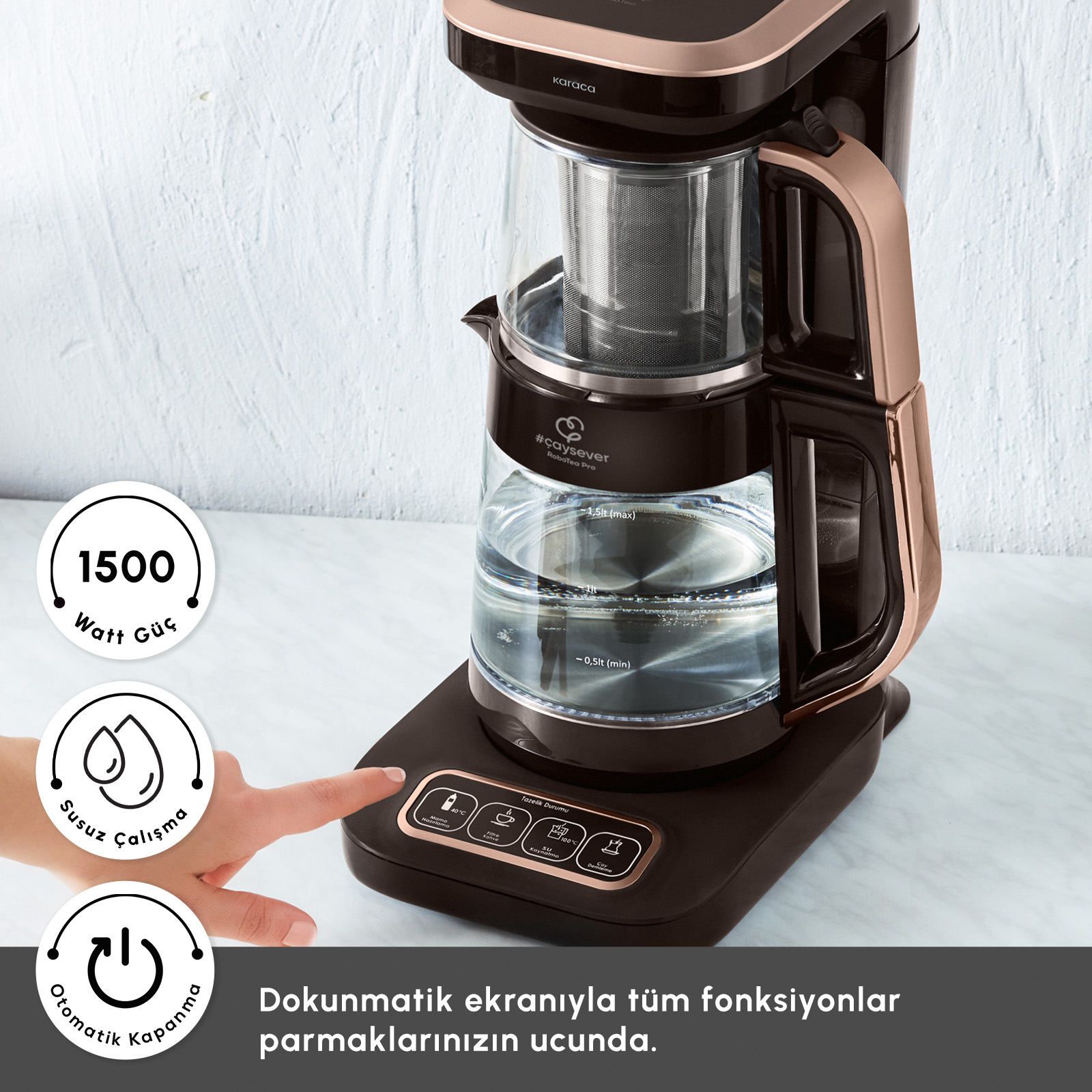 Tüm bu rahat kullanımın yanında, çay demliği ve su ısıtıcısının cam yapısı sayesinde sağlıklı ve uzun ömürlü bir kullanım sunar.