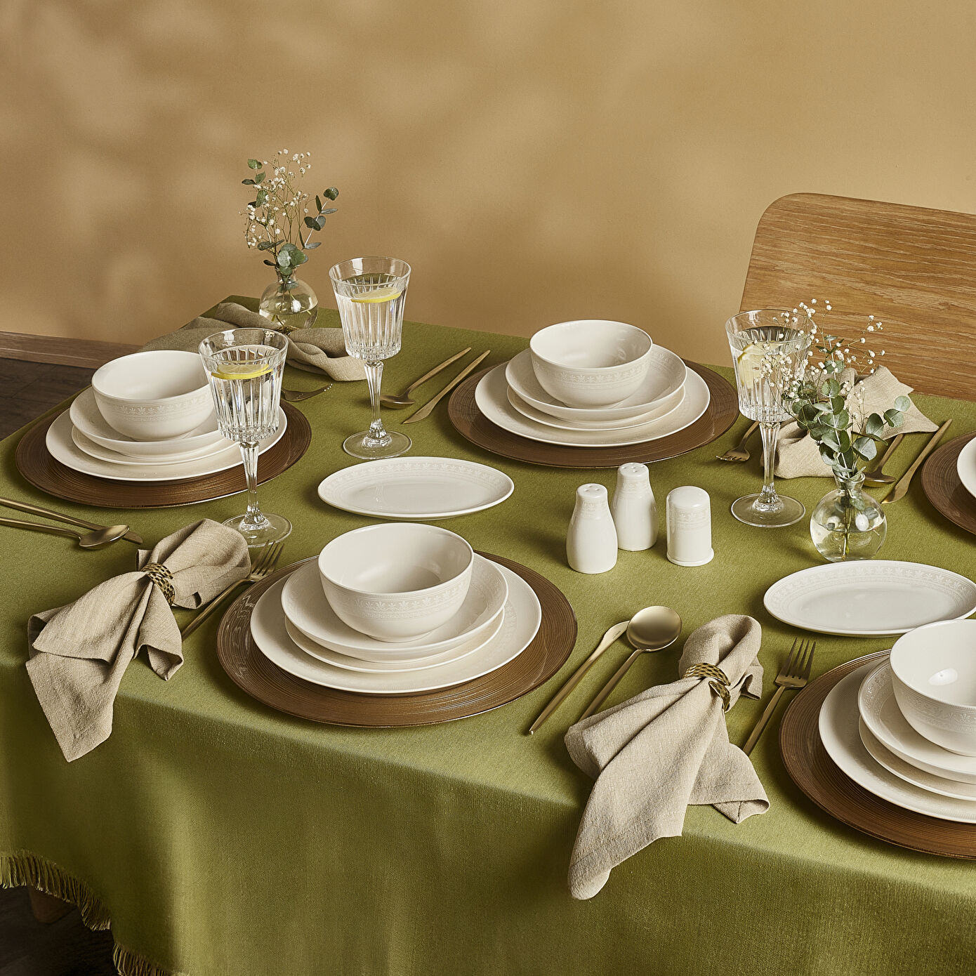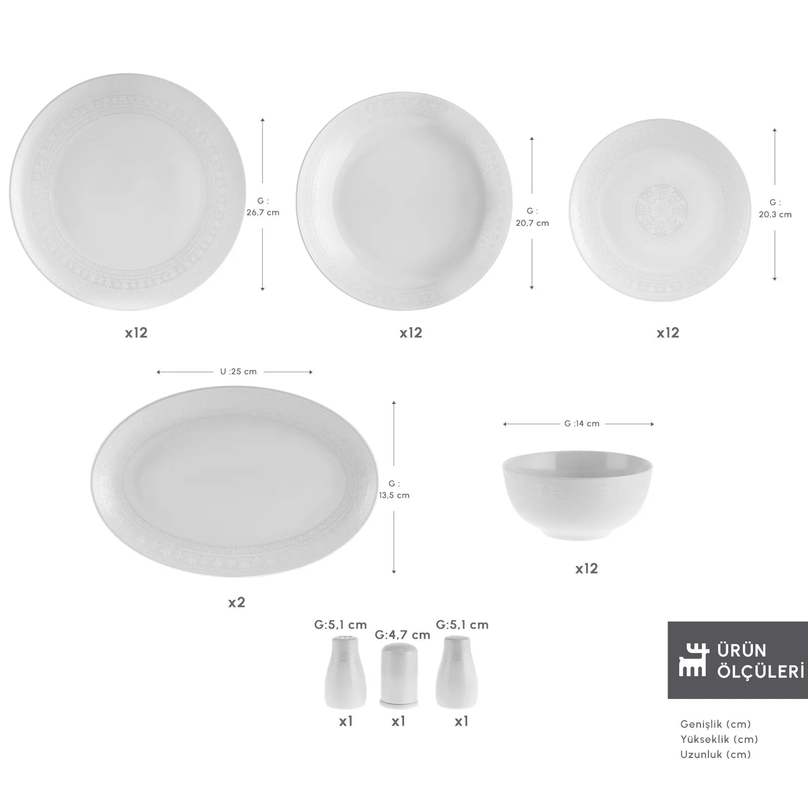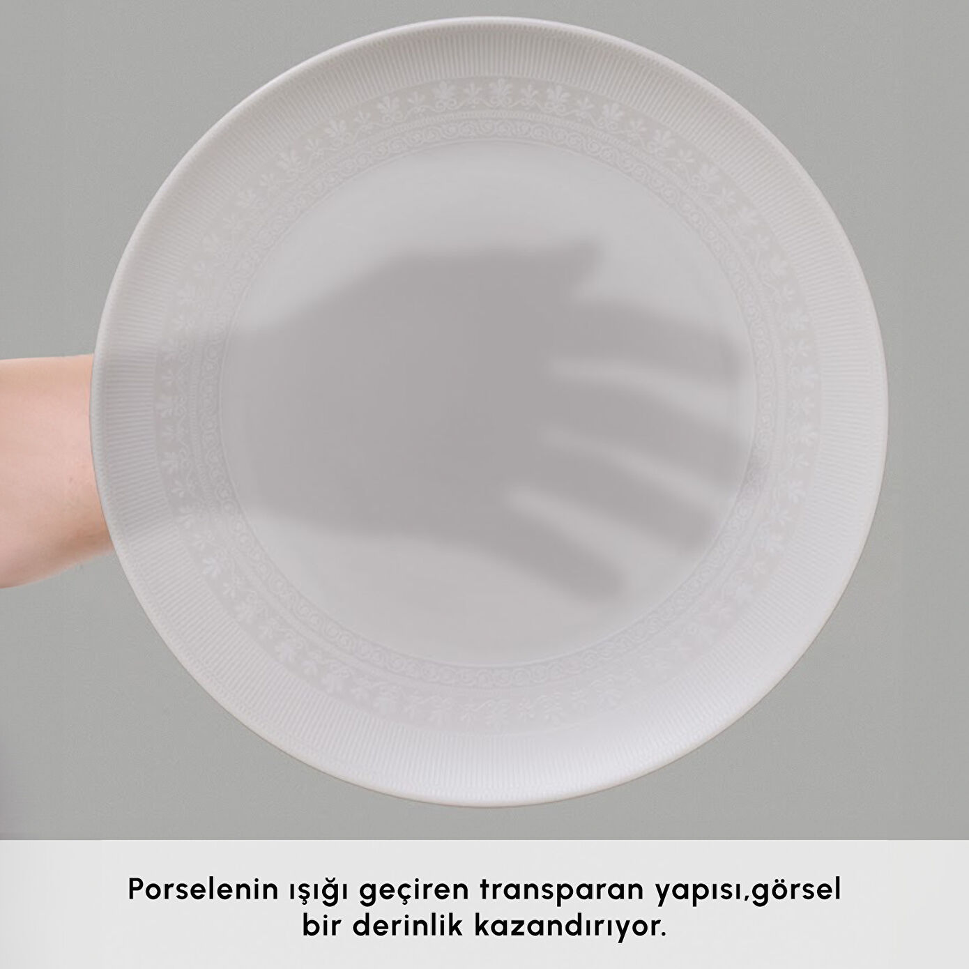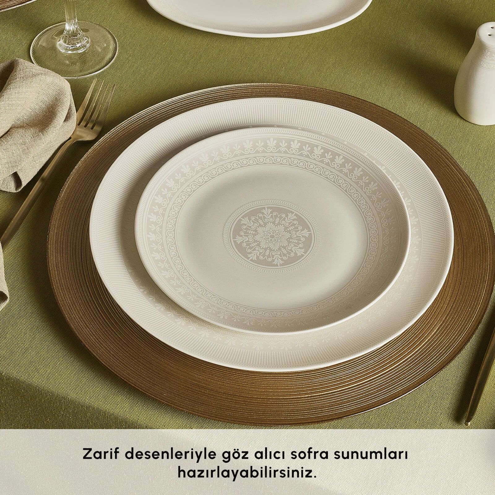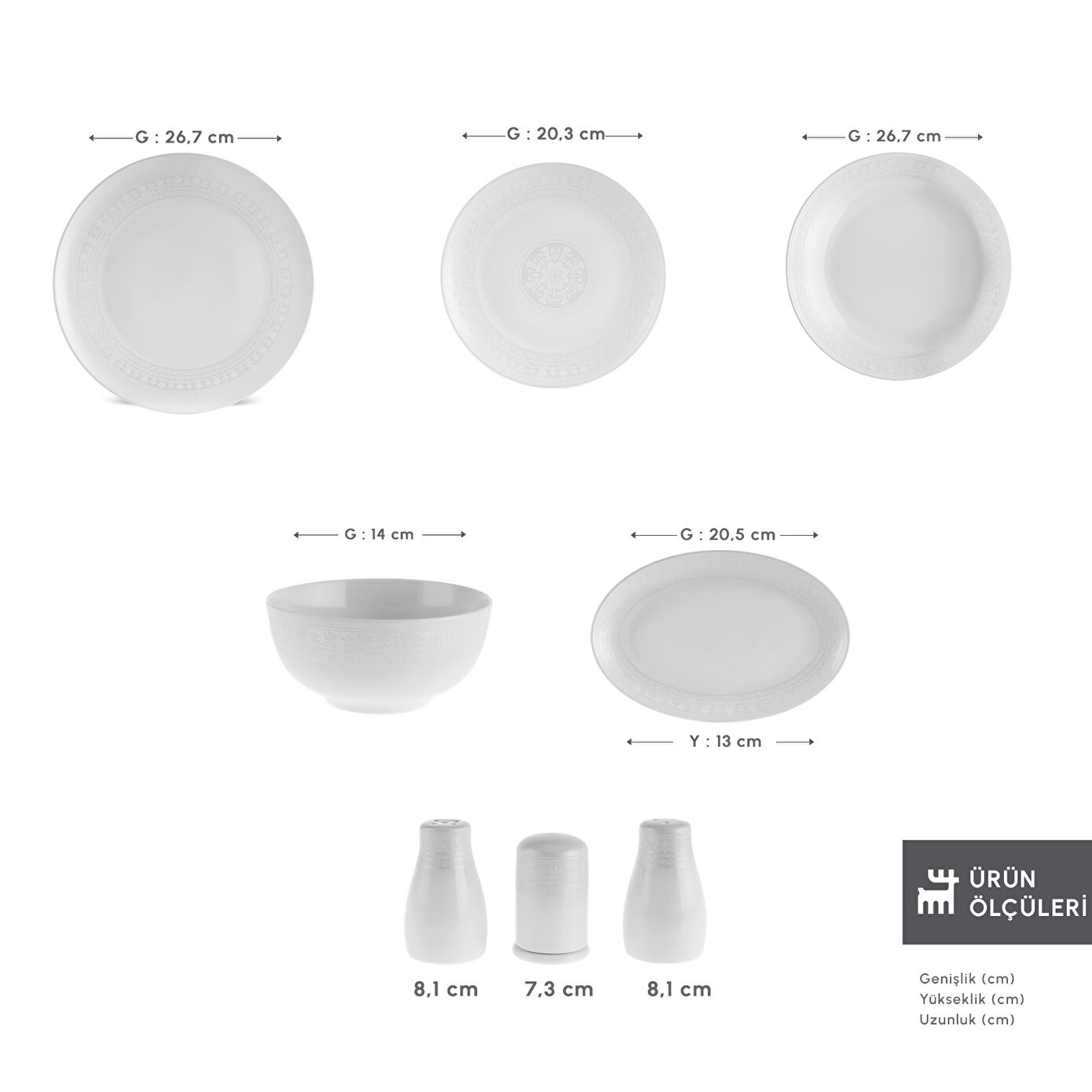 Karaca Forever Bone Artiste 53 Parça 12 Kişilik Yemek Takımı geleneksel Türk el sanatlarından gelen el işçiliğini incelikli tasarım çizgisi ve dokusu ile benzersiz bir ahenk oluşturur. Size ve misafirlerinize “ayrıcalıklı” hissettirir. 53 parça içeriği ile her yönüyle “tam” bir sofra kurmanızı sağlayacak. Karaca Forever Bone Artiste 53 Parça 12 Kişilik New Bone yemek takımını kullanarak hem özel günlerde hem de günlük sofralarınızda davet şıklığı elde edebilirsiniz. Geniş set içerisinde 12’şer adet servis tabağı, yemek tabağı, pasta tabağı ve kâsenin yanı sıra masa ortasında kullanabileceğiniz 1 adet küçük, 1 adet büyük kayık tabaklar, biberlikl, kürdanlık ve tuzluk bulunmaktadır.