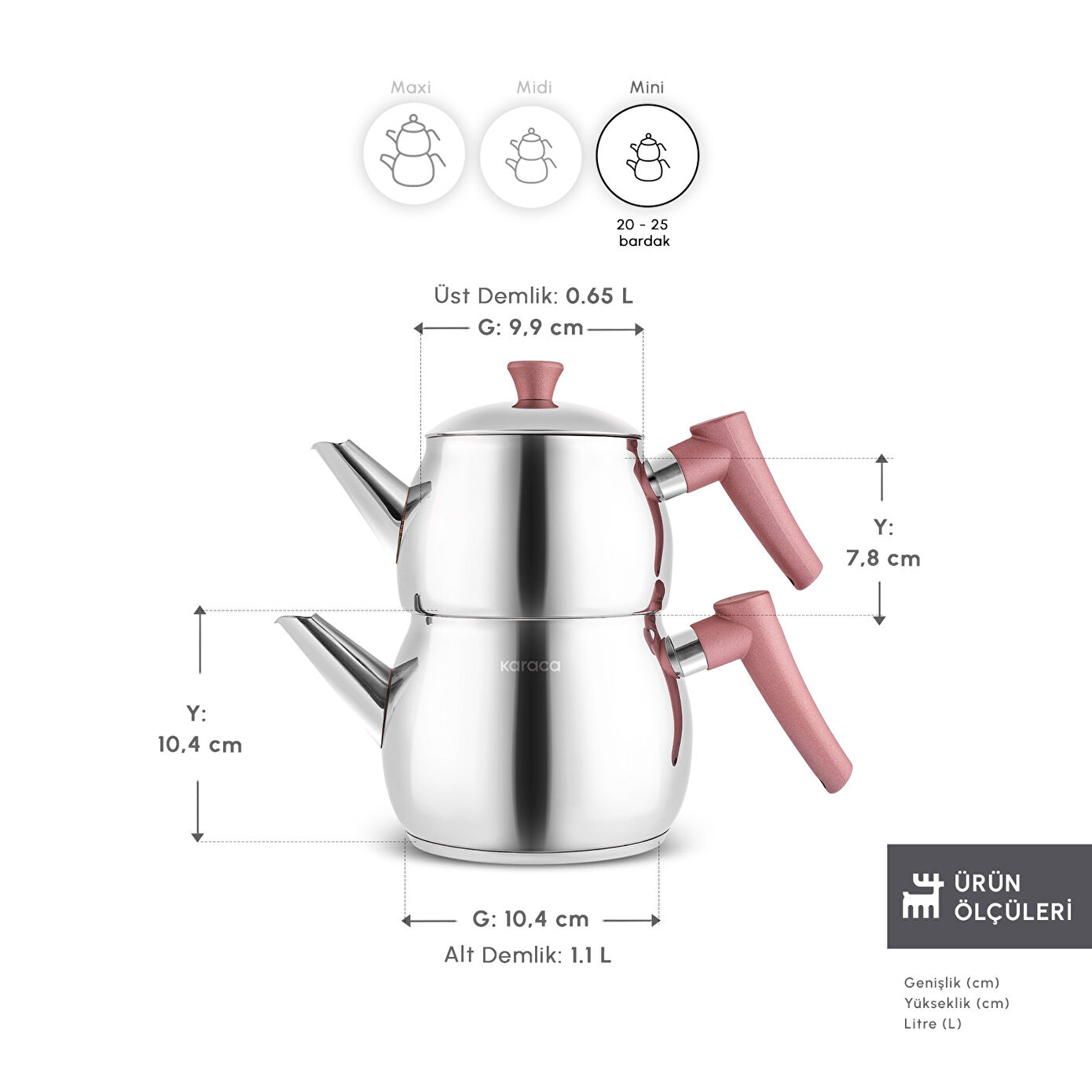 Karaca Frezya Mini Çaydanlık Takımı Rose 0,65 litre demlik ve 1,1 litre su haznesi ile çayınızı tam tadında demler.Paslanmaz çelik yapısı sayesinde sağlıklı ve uzun ömürlü bir kullanım sunar.