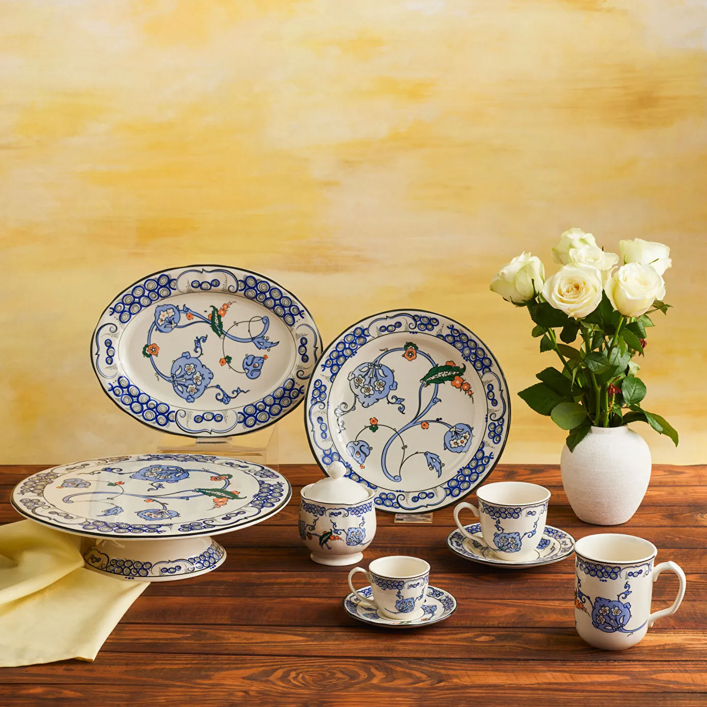 - Ayaklı Kek Standı ve Sunum Tabakları:Hem şık sunumlar yapın hem sofranıza sanatsal bir dokunuş katın. Renk uyumu ve desen bütünlüğüyle göz alıcı bir atmosfer oluşturun.