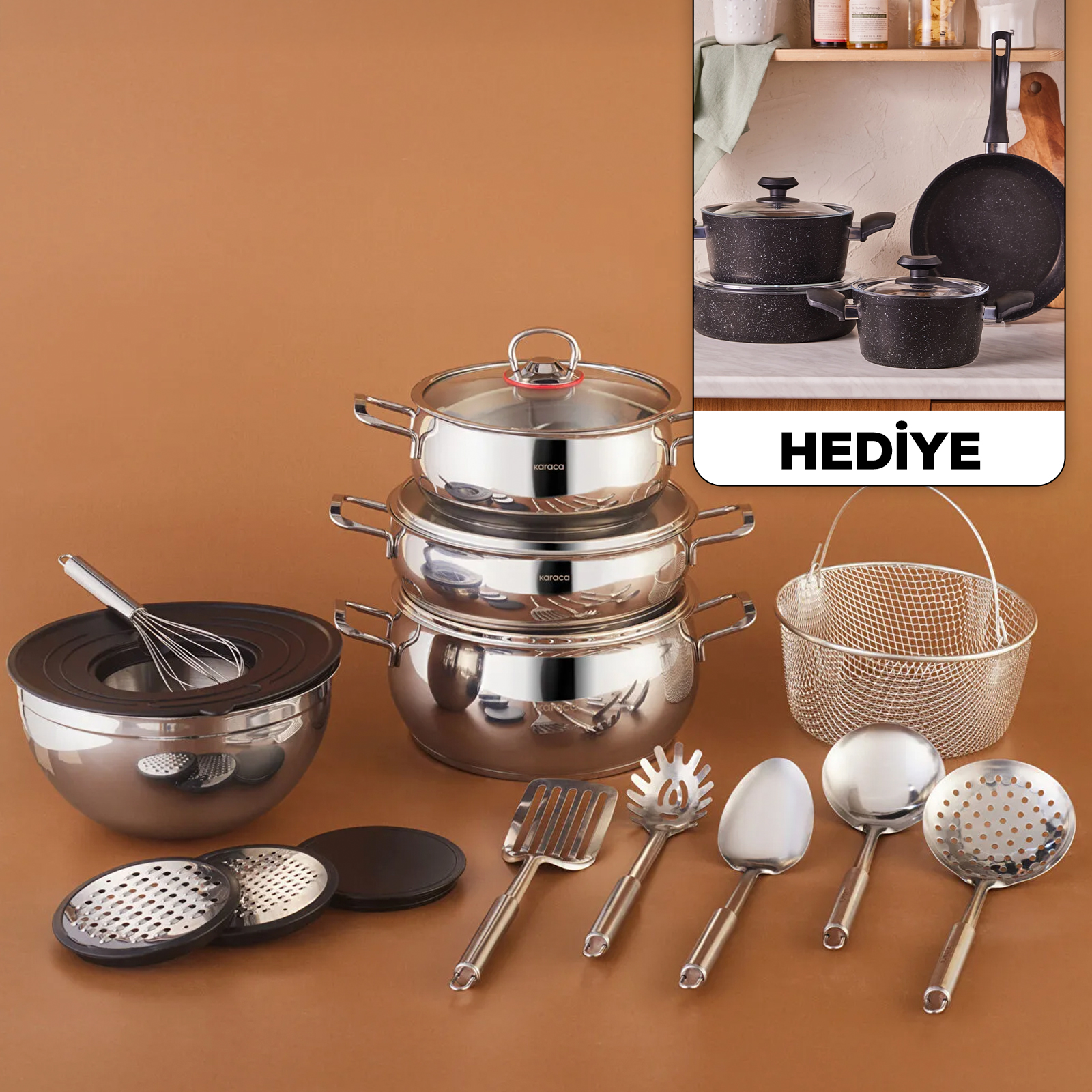 Karaca Karıştır-Pişir-Sakla 18 Parça Çelik Tencere Seti