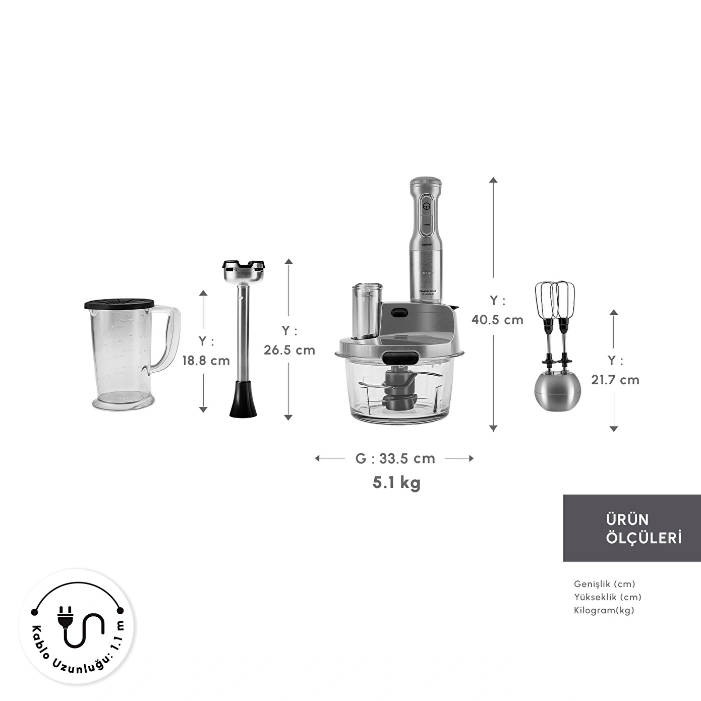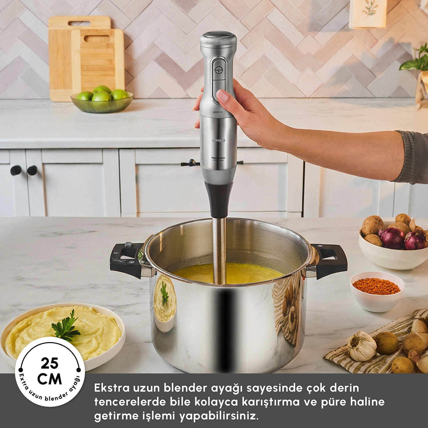 - Ekstra uzun blender ayağı sayesinde çok derin tencerelerde bile kolayca karıştırma ve püre haline getirme işlemi yapabilirsiniz.
