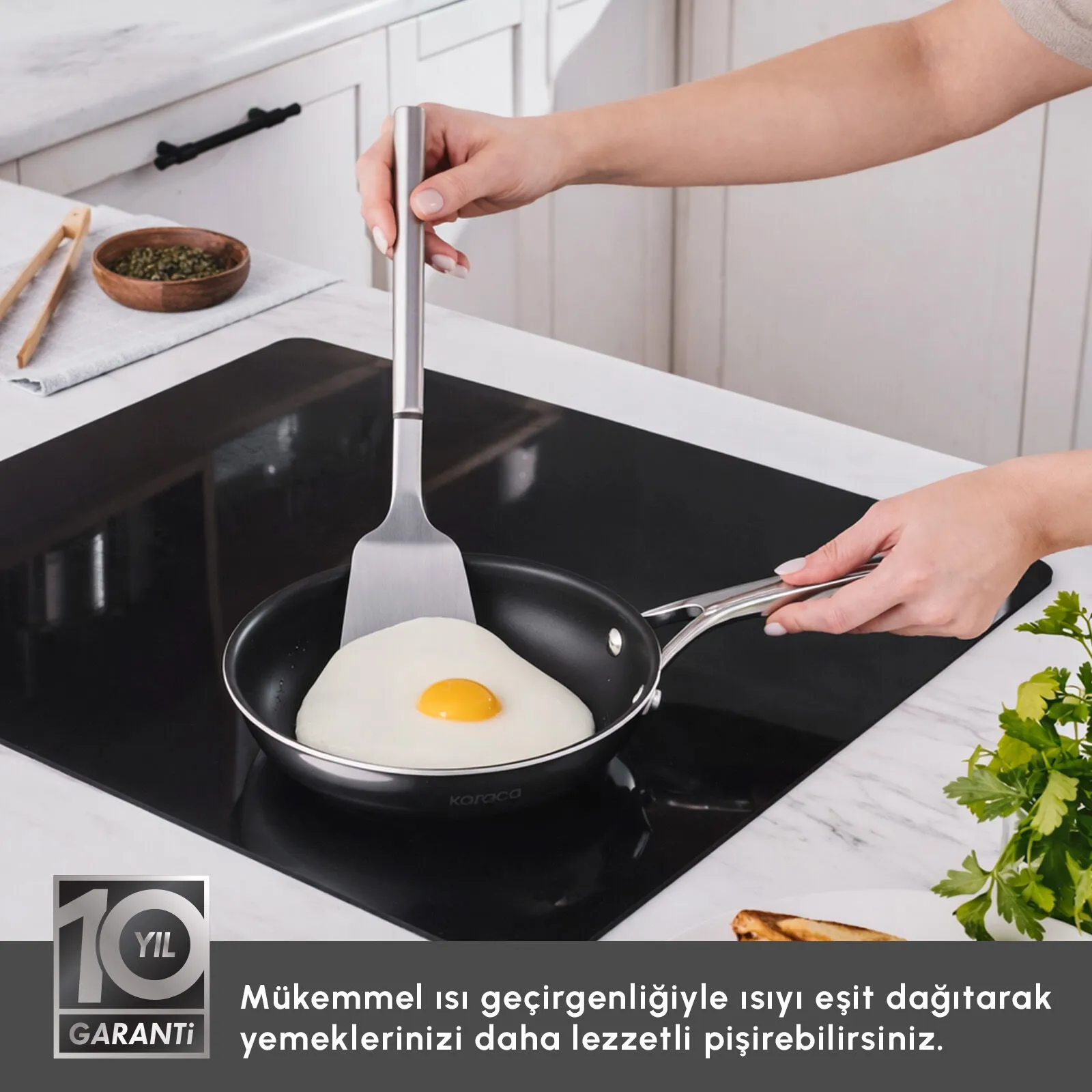 İndüksiyon tabanlı yapısı sayesinde indüksiyon dahil tüm ocak tiplerinde ve fırında kullanıma uygundur. Üç katmanlı gövdesi, ısıyı eşit şekilde dağıtarak omlet, kahvaltılıklar, sebze sote ve küçük porsiyonlarda ideal pişirme performansı sağlar. Bulaşık makinesinde yıkanabilir ve yapışmaz çelik yüzeyi sayesinde yalnızca ıslak bir bezle bile kolayca temizlenebilir.