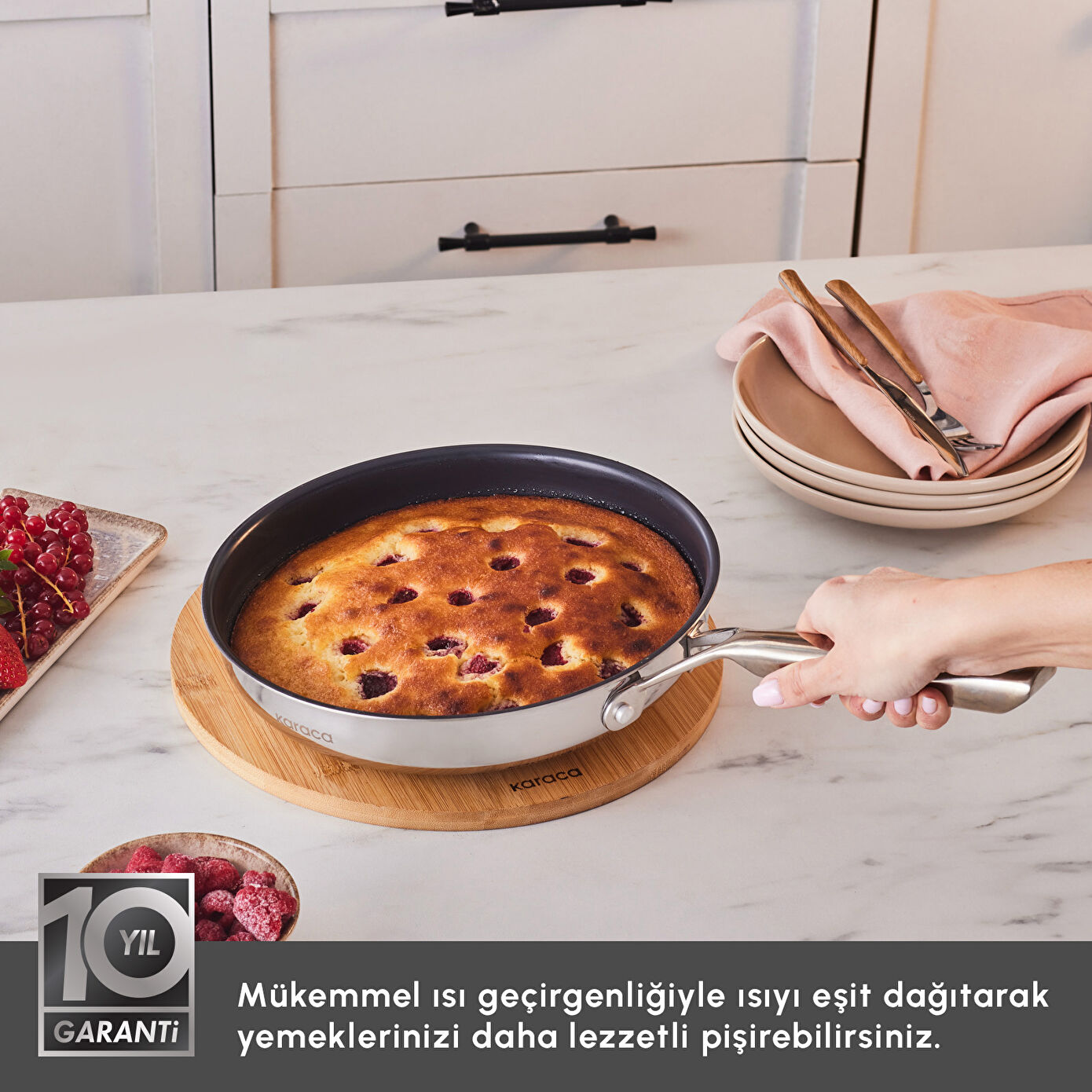 İndüksiyon tabanlı yapısı sayesinde indüksiyon dahil tüm ocak tiplerinde ve fırında kullanıma uygundur. Üç katmanlı gövdesi, ısıyı eşit şekilde dağıtarak et, tavuk, balık ve sebze gibi tariflerde ideal pişirme performansı sağlar. Bulaşık makinesinde yıkanabilir ve yapışmaz çelik yüzeyi sayesinde yalnızca ıslak bir bezle bile kolayca temizlenebilir.