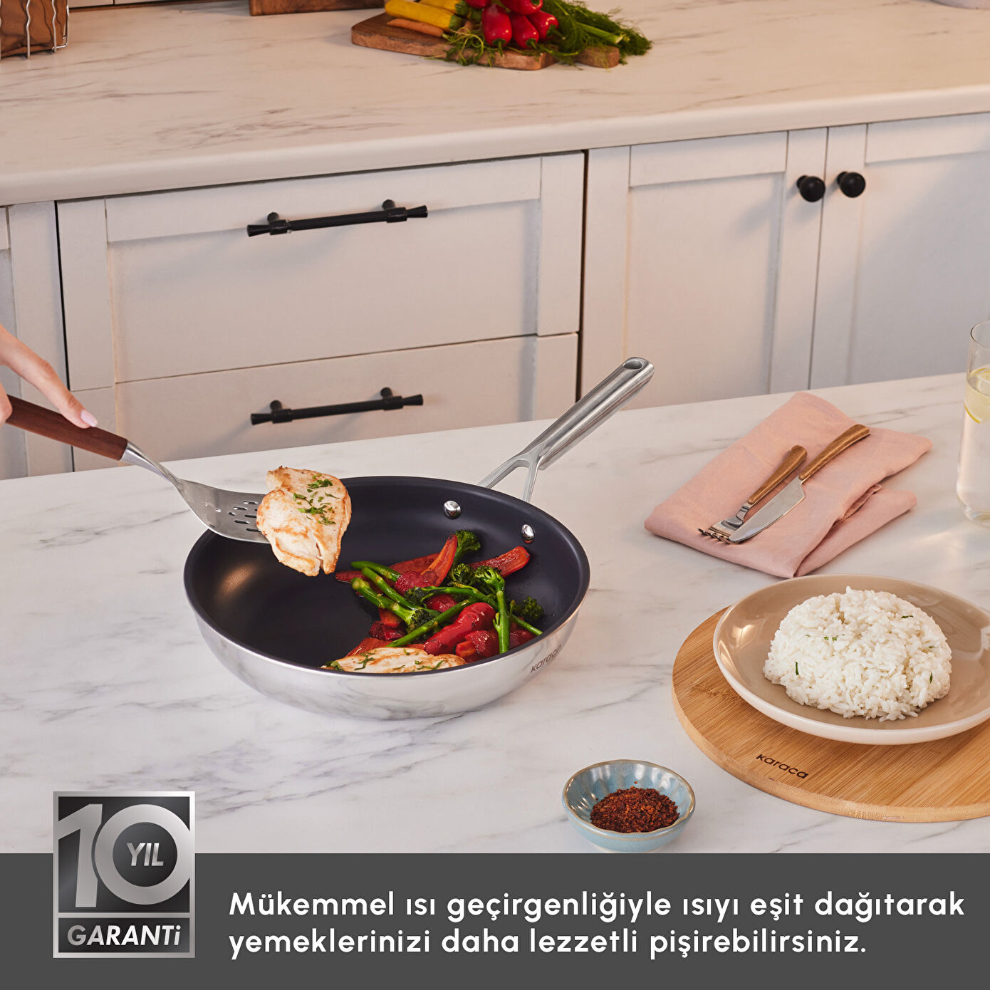 İndüksiyon tabanlı yapısı sayesinde indüksiyon dahil tüm ocak tiplerinde ve fırında kullanıma uygundur. Üç katmanlı gövdesi, ısıyı eşit şekilde dağıtarak et, tavuk, balık ve sebze gibi tariflerde ideal pişirme performansı sağlar. Bulaşık makinesinde yıkanabilir ve yapışmaz çelik yüzeyi sayesinde yalnızca ıslak bir bezle bile kolayca temizlenebilir.