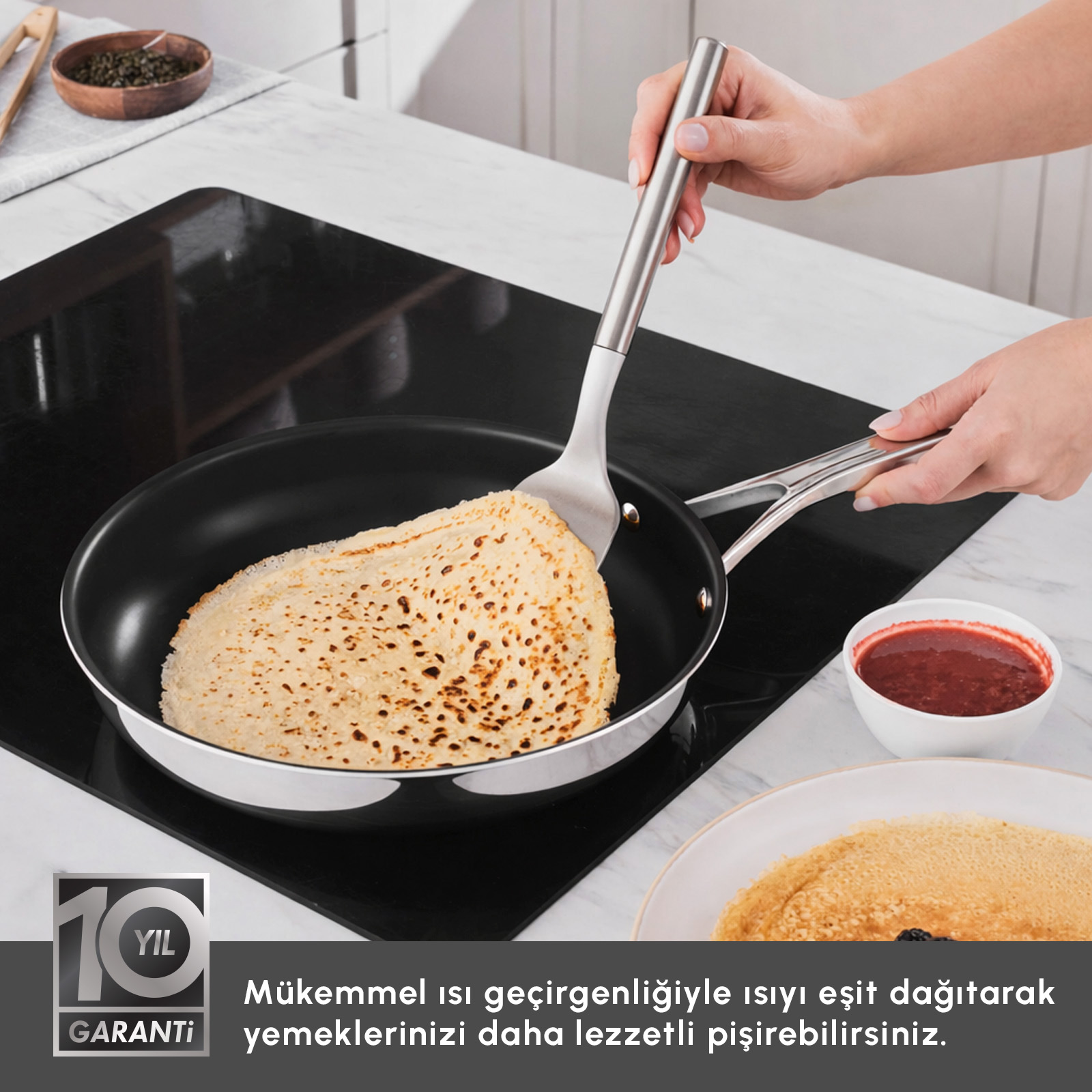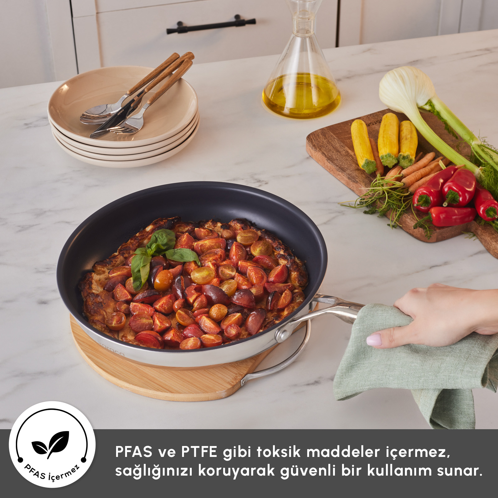 İndüksiyon tabanlı yapısı sayesinde indüksiyon dahil tüm ocak tiplerinde ve fırında kullanıma uygundur. Üç katmanlı gövdesi, ısıyı eşit şekilde dağıtarak et, tavuk, balık ve sebze gibi tariflerde ideal pişirme performansı sağlar. Bulaşık makinesinde yıkanabilir ve yapışmaz çelik yüzeyi sayesinde yalnızca ıslak bir bezle bile kolayca temizlenebilir.