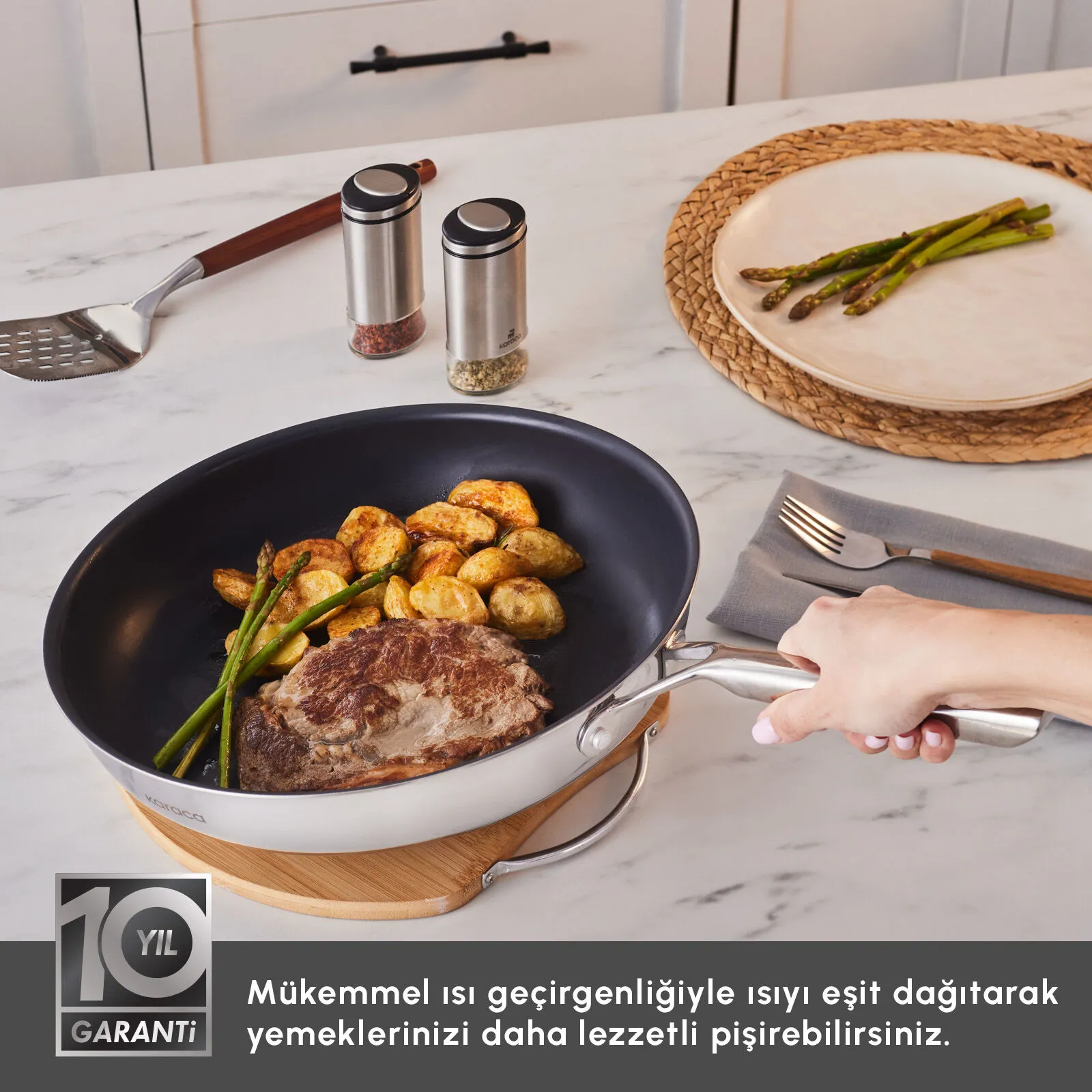 İndüksiyon tabanlı yapısı sayesinde indüksiyon dahil tüm ocak tiplerinde ve fırında kullanıma uygundur. Üç katmanlı gövdesi, ısıyı eşit şekilde dağıtarak et, tavuk, balık ve sebze gibi tariflerde ideal pişirme performansı sağlar. Bulaşık makinesinde yıkanabilir ve yapışmaz çelik yüzeyi sayesinde yalnızca ıslak bir bezle bile kolayca temizlenebilir.