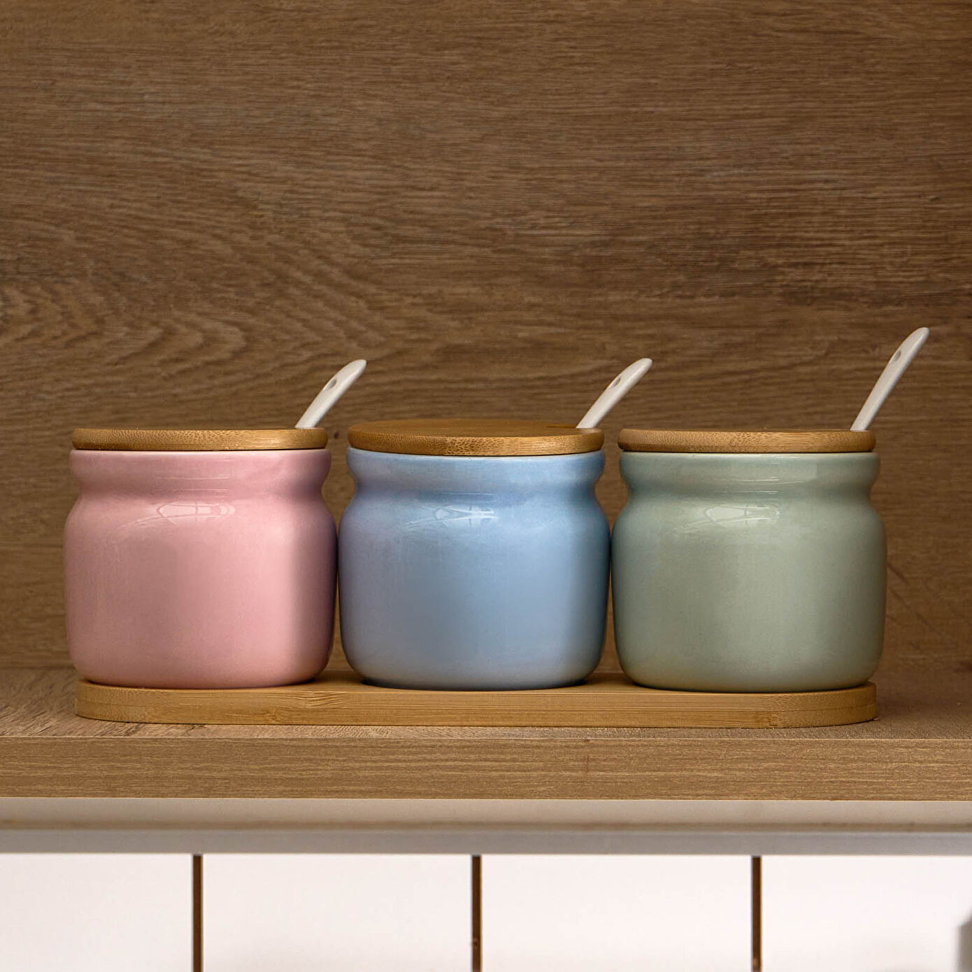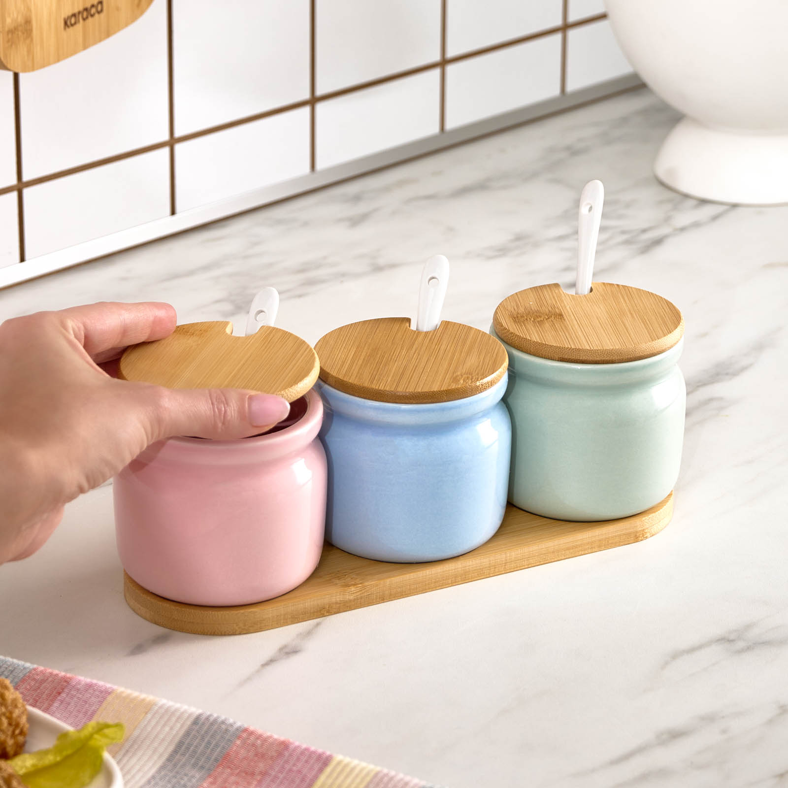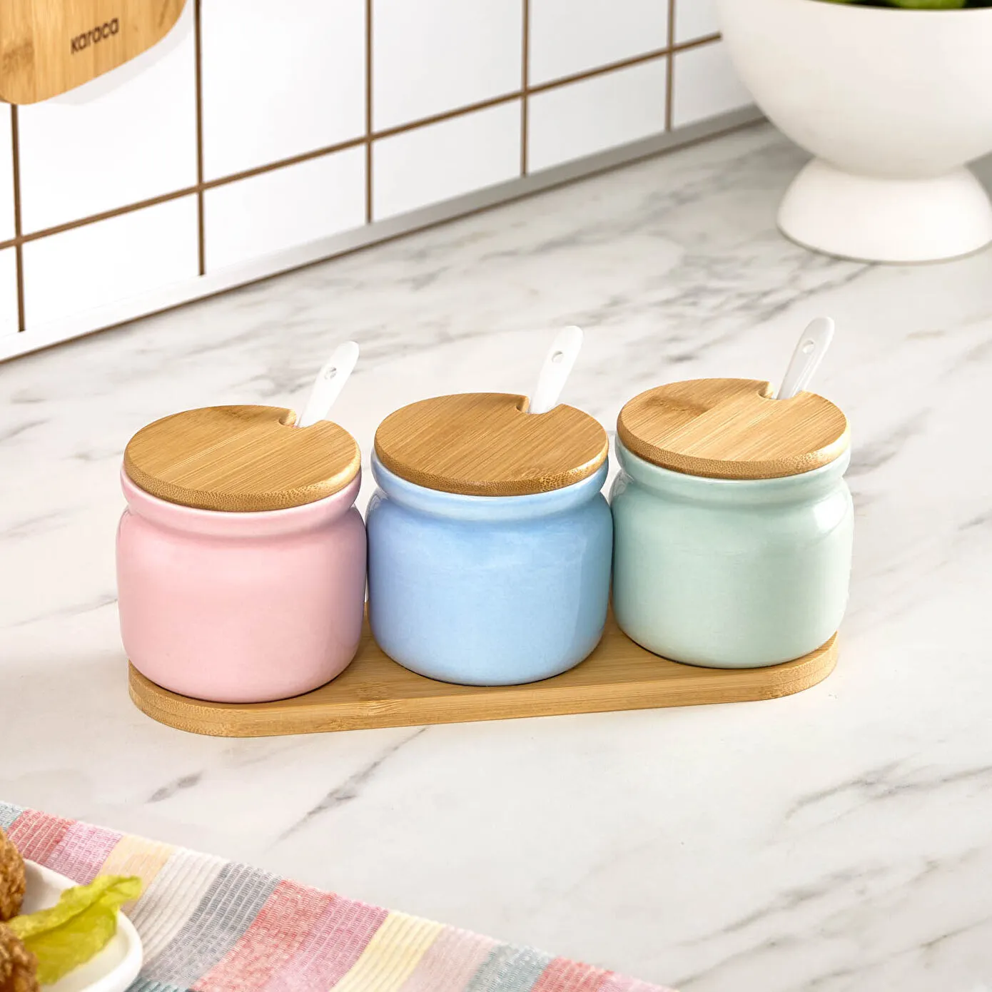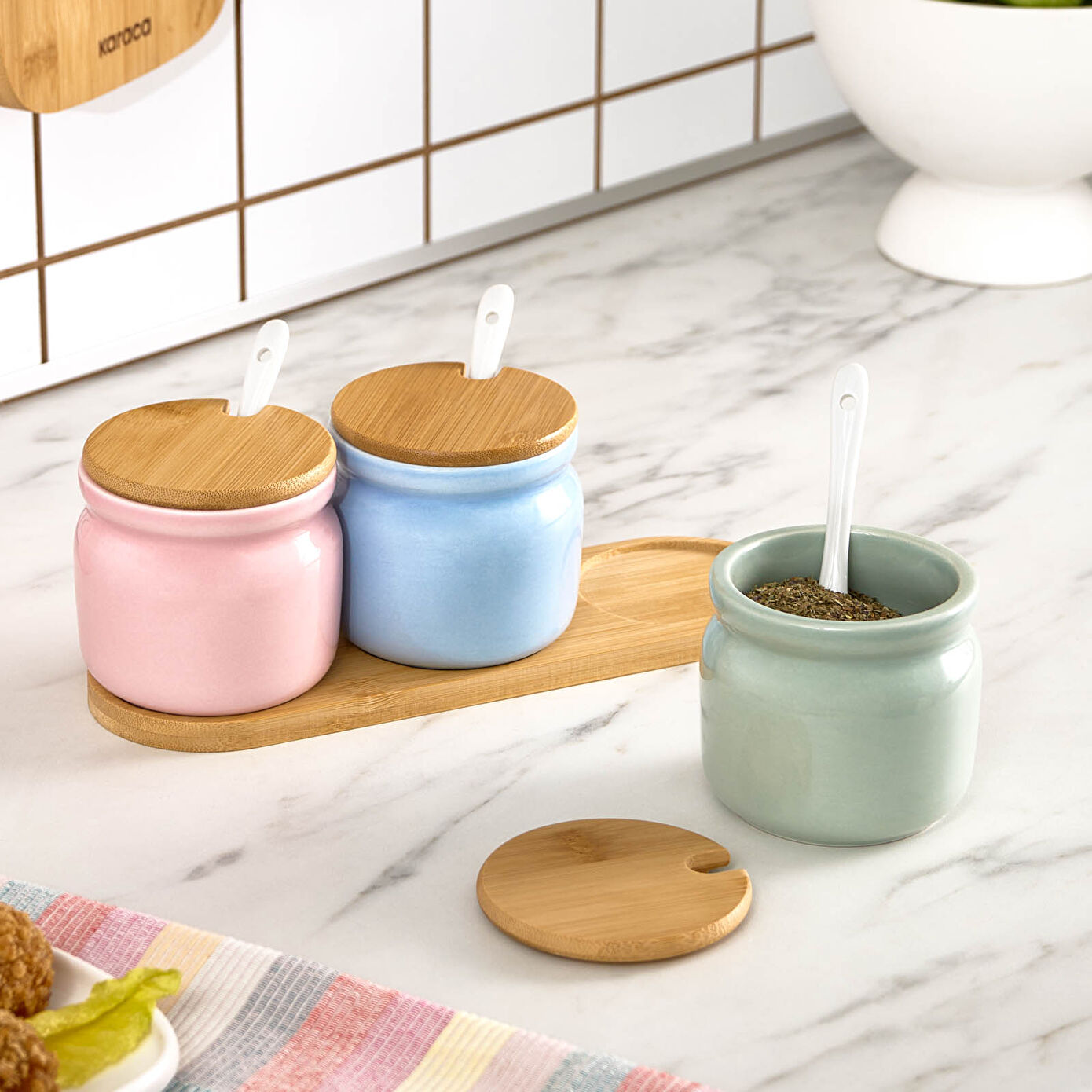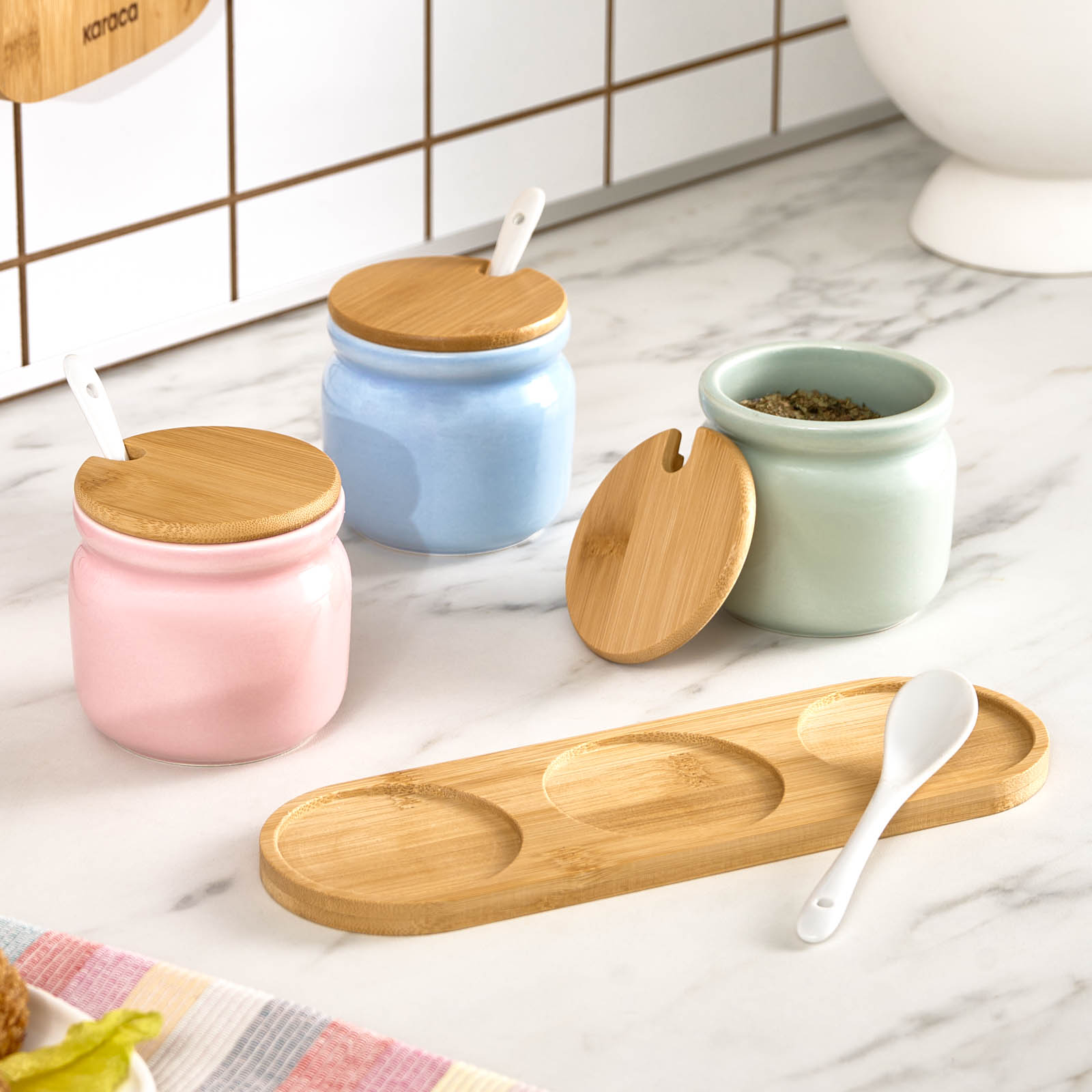 Karaca Portobello Bambu Kapaklı 3'lü Tepsili Kaşıklı Baharat Takımı