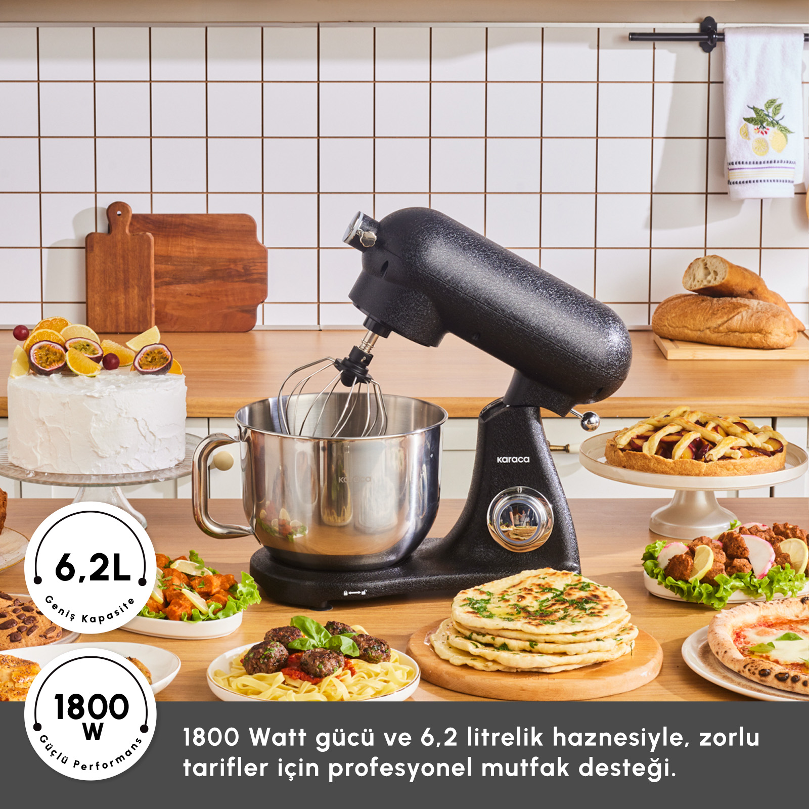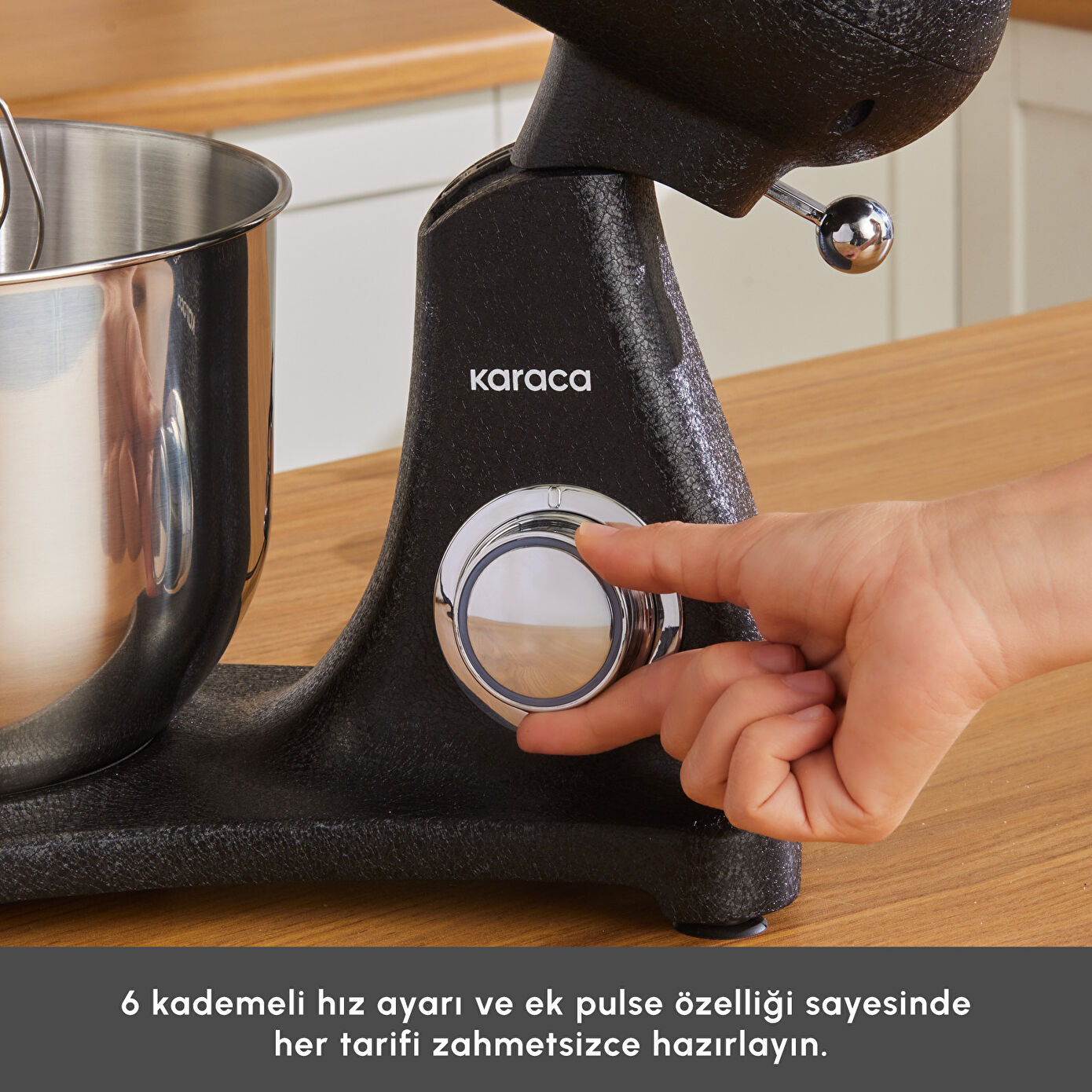 Özel tasarımlı Karaca logolu, 6,2 litrelik paslanmaz çelik, kulplu, geniş kasesiyle tek seferde 1,5 kg hamuru hızlıca karıştırır.