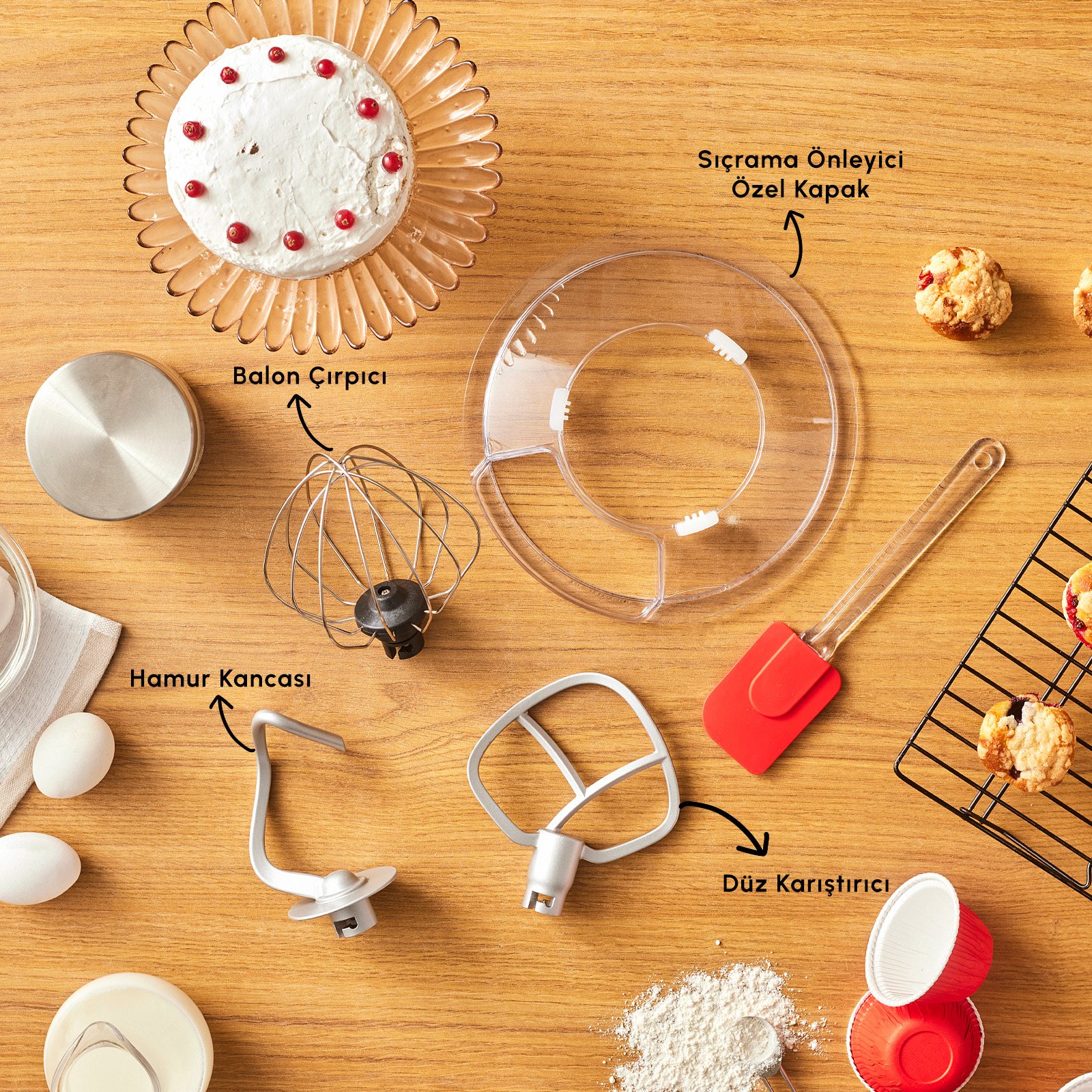 Balon çırpıcı ile sıvı karışımları hızlı ve homojen şekilde karıştırmanızı sağlarken, elde edilmek istenen hamur düzeyine göre kullanılabilecek düz karıştırıcı ya da hamur kancası ile mükemmel sonuçlar elde etmenizi sağlar.