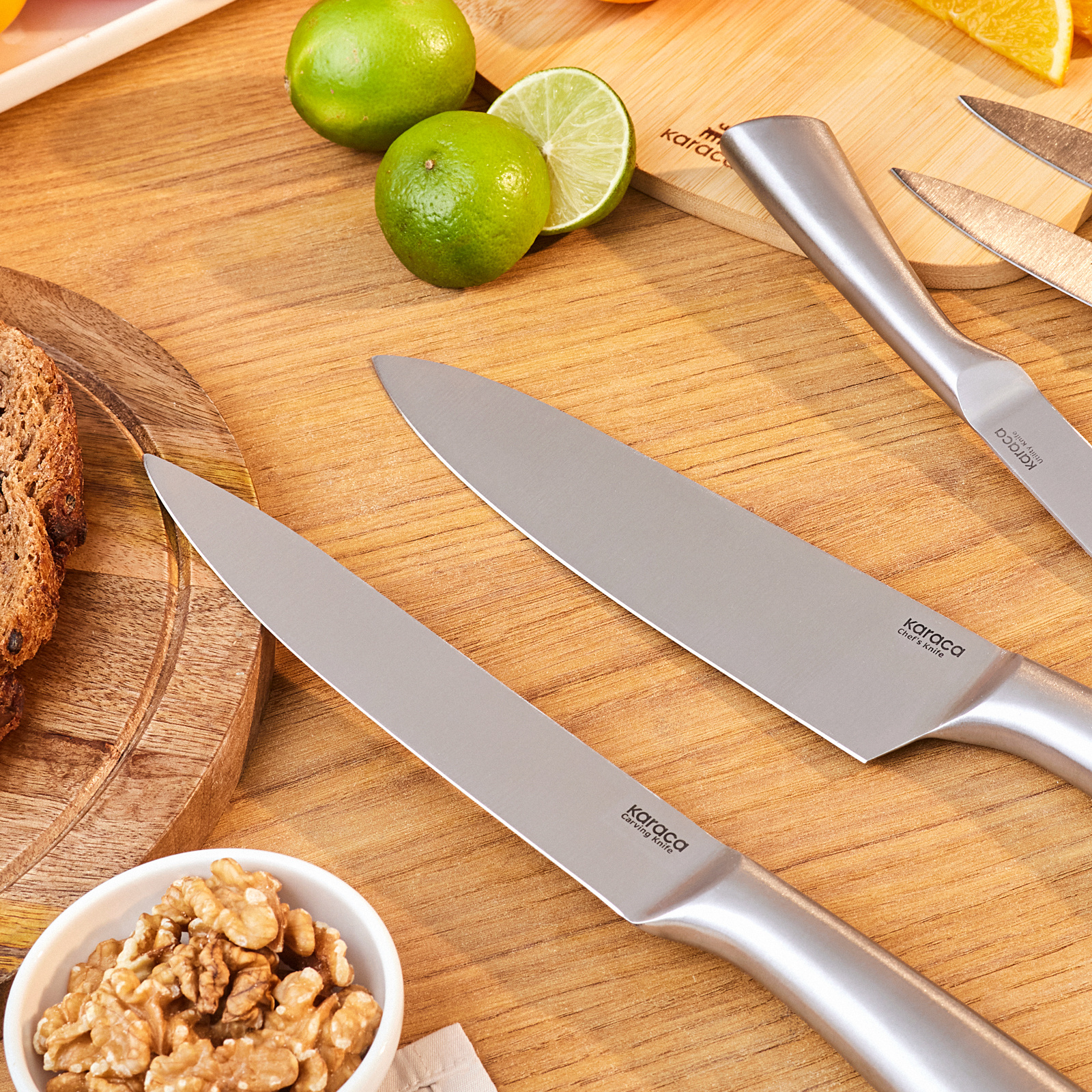 Mutfakta şıklığı ve fonksiyonelliği bir araya getiren bu 6 parçalı bıçak seti, günlük kullanım için ideal tasarımıyla öne çıkıyor. Performer çeliği ile üretilmiş bıçaklar, uzun ömürlü keskinlik ve dayanıklılık sunar. Saplarının konforu sayesinde güvenli ve konforlu bir tutuş sağlar.